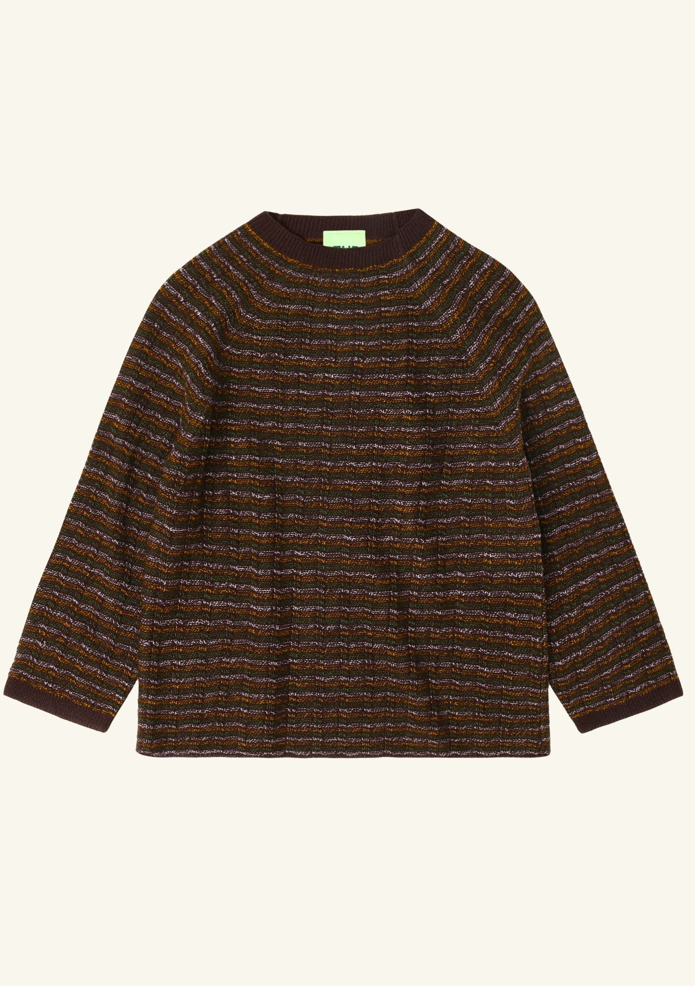 Denne sweater er lavet af ren merinould og har en ribstrikket halskant, raglanærmer og en afslappet pasform. Den er strikket i en klassisk ribstruktur med smalle garnfarvede striber. Vores merinould er BLUESIGN® og RWS certificeret, fri for skadelig kemi og stammer fra får, der ikke har været udsat for mulesing.