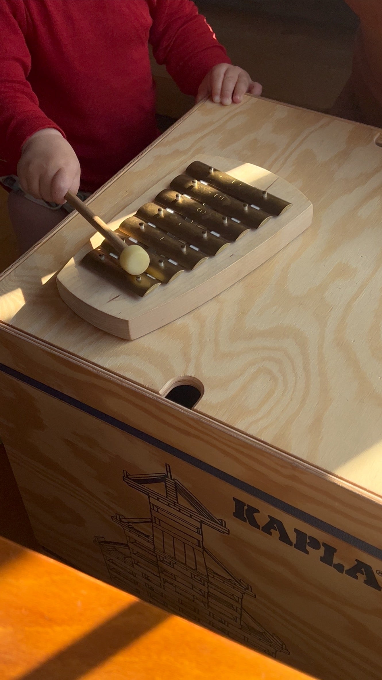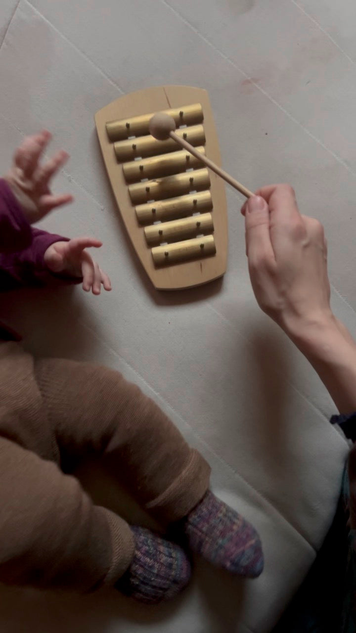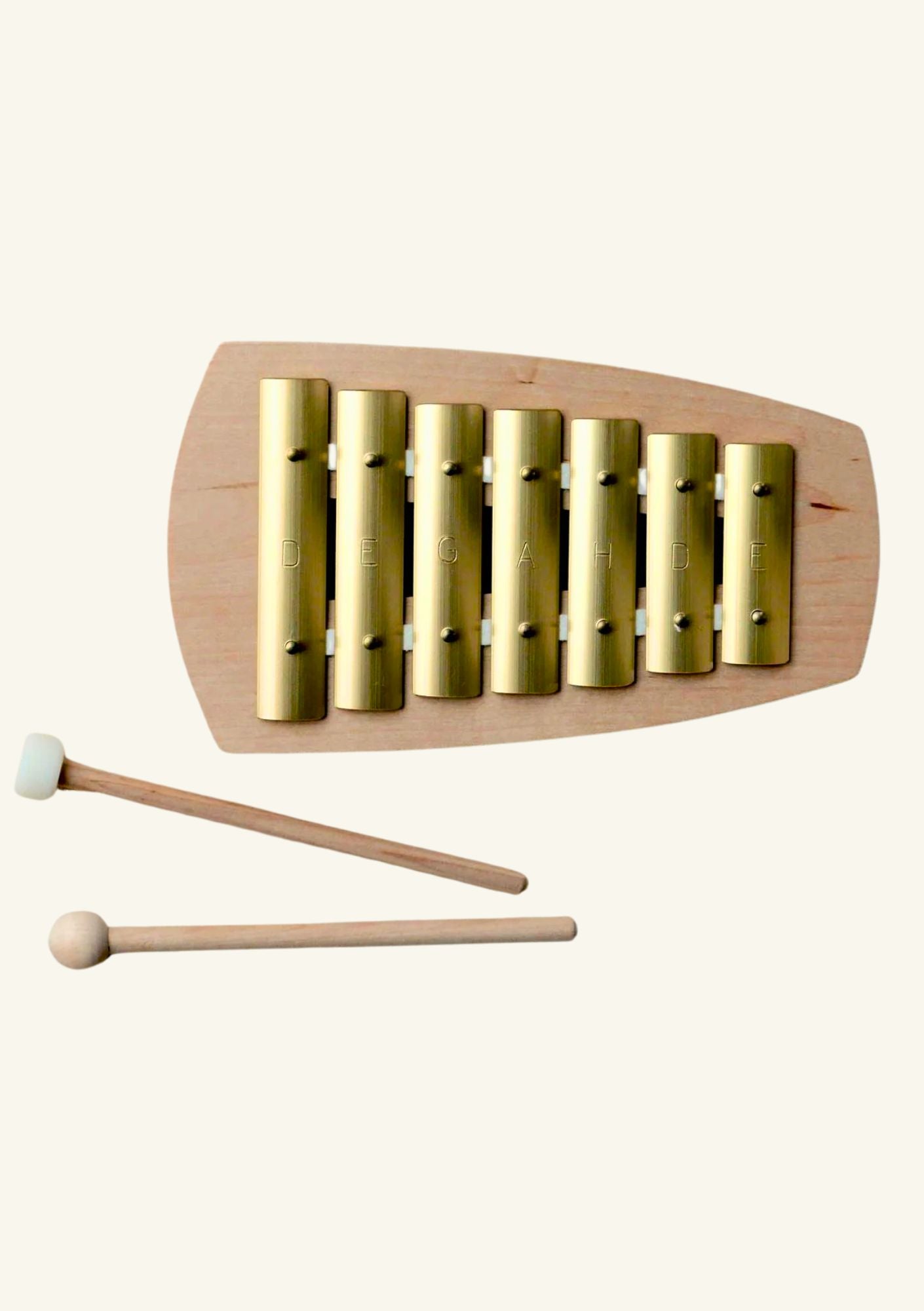 For bruk hjemme, i barnehagen ved musikklek, historiefortelling og mye mer. Kommer med en tre og en gummi klubbe. Material: Klangstavar av messing på stamme av bjørk