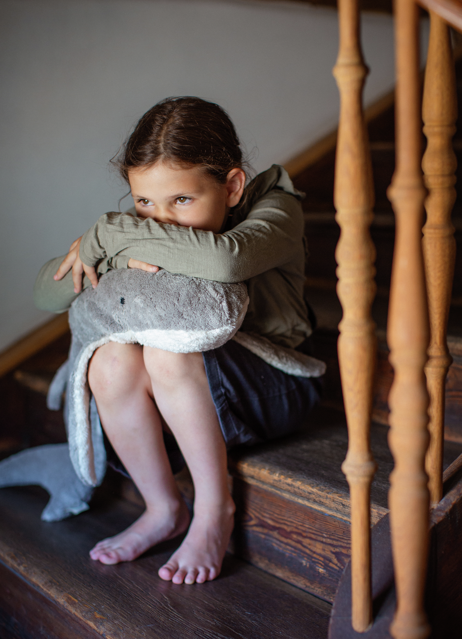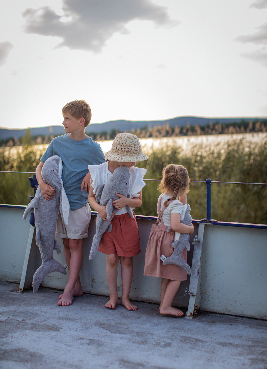 Fløyelsmyk hai som blir en venn for livet. Denne lekne og myke kosevennen bringer havets magi inn i hverdagen – både som en rolig følgesvenn og som et vakkert element på barnerommet.