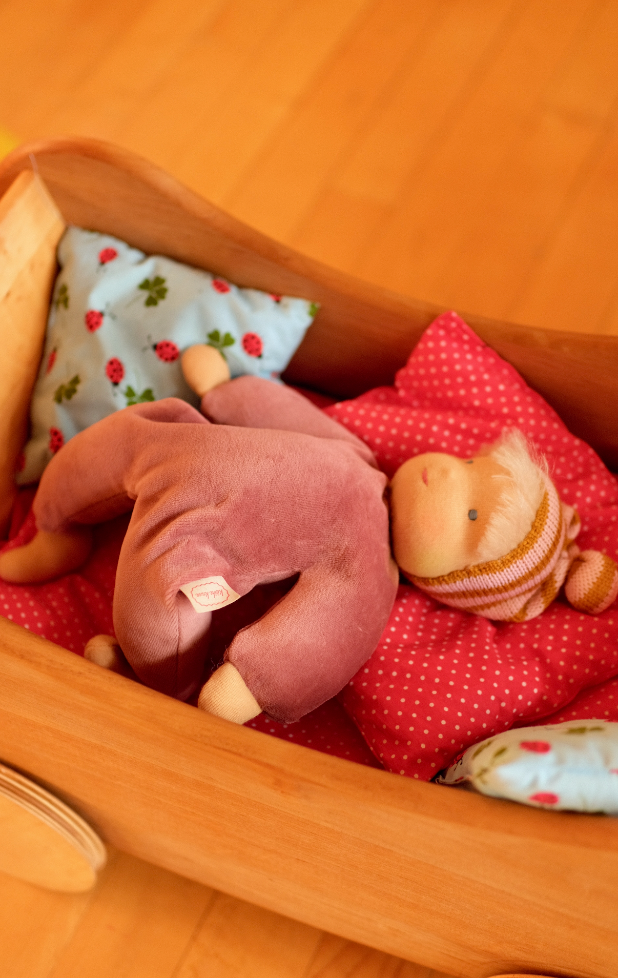Nana er den største kosedukken i Waldorf-dukkefamilien til Käthe Kruse– en myk og god venn som alltid er der, uansett hvor dagen fører. Hun gir trøst, selskap og trygghet, enten hun blir med i vognen, i sengen eller i leken.
