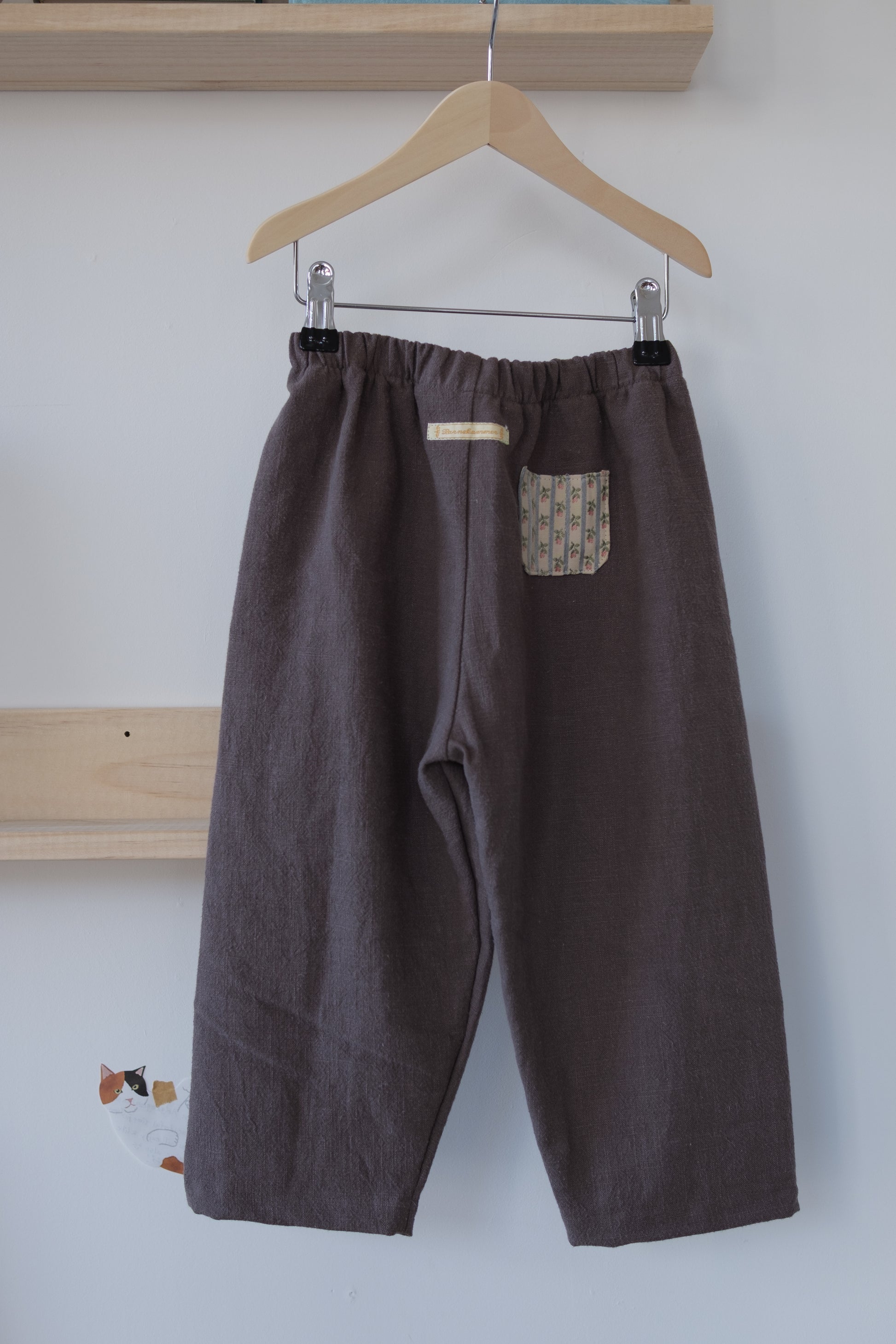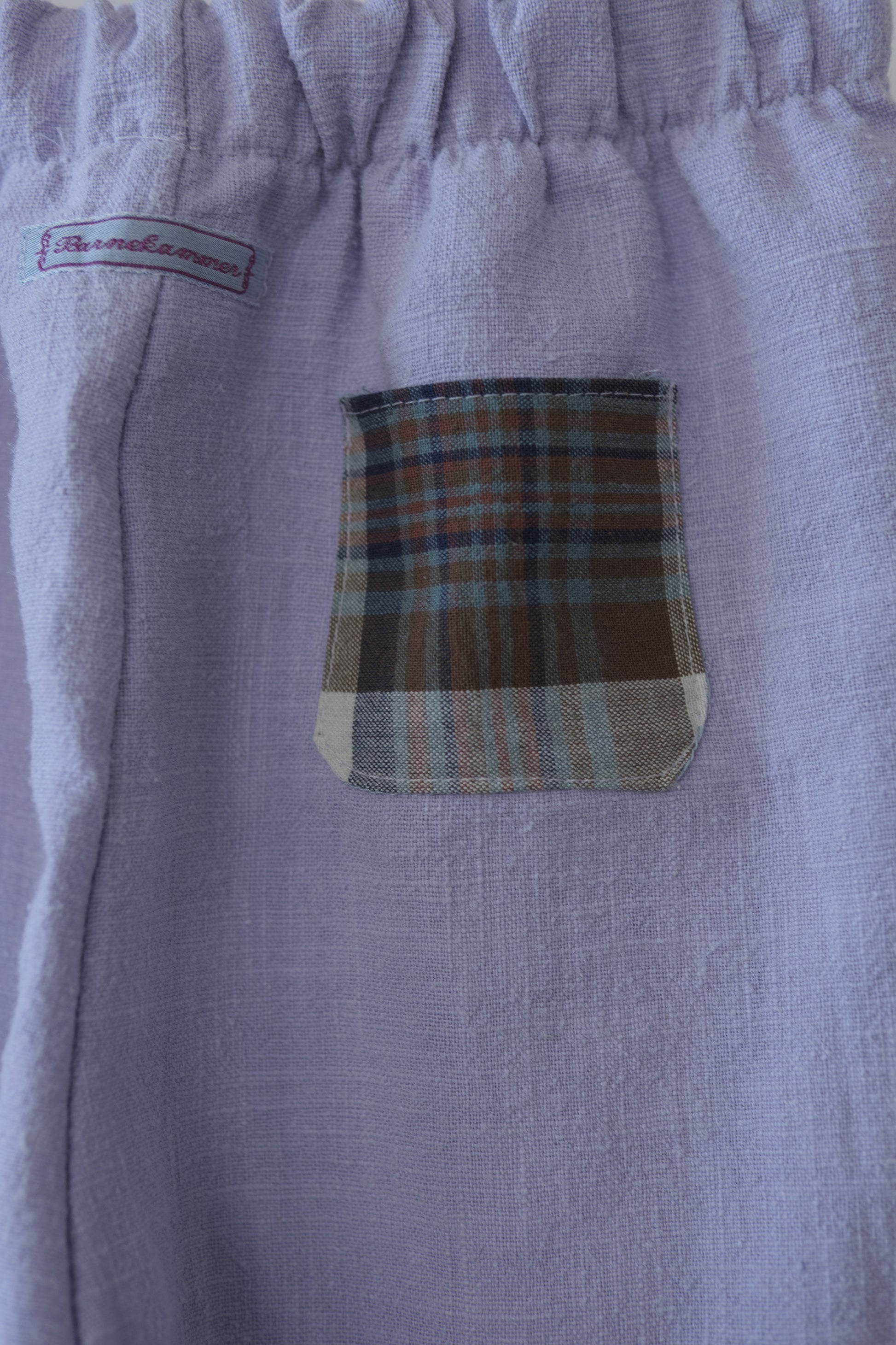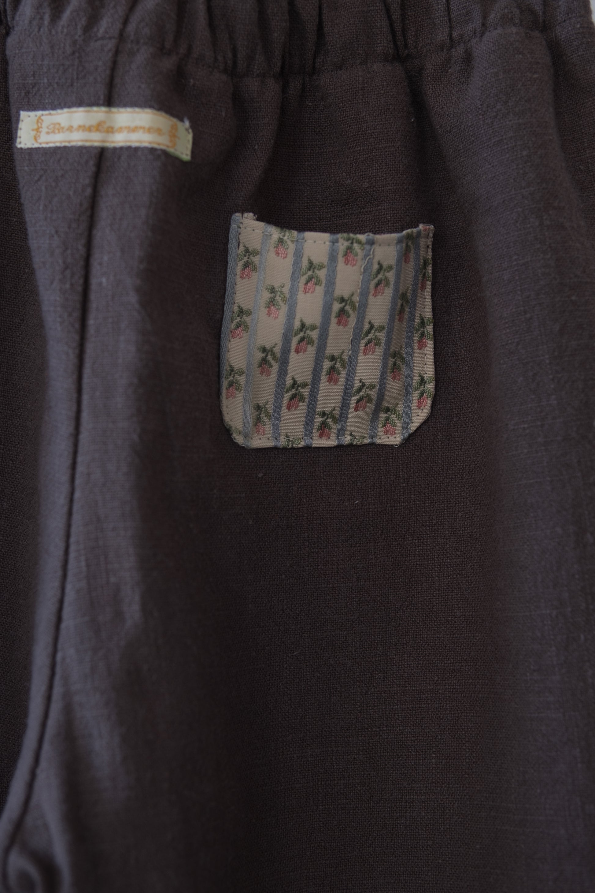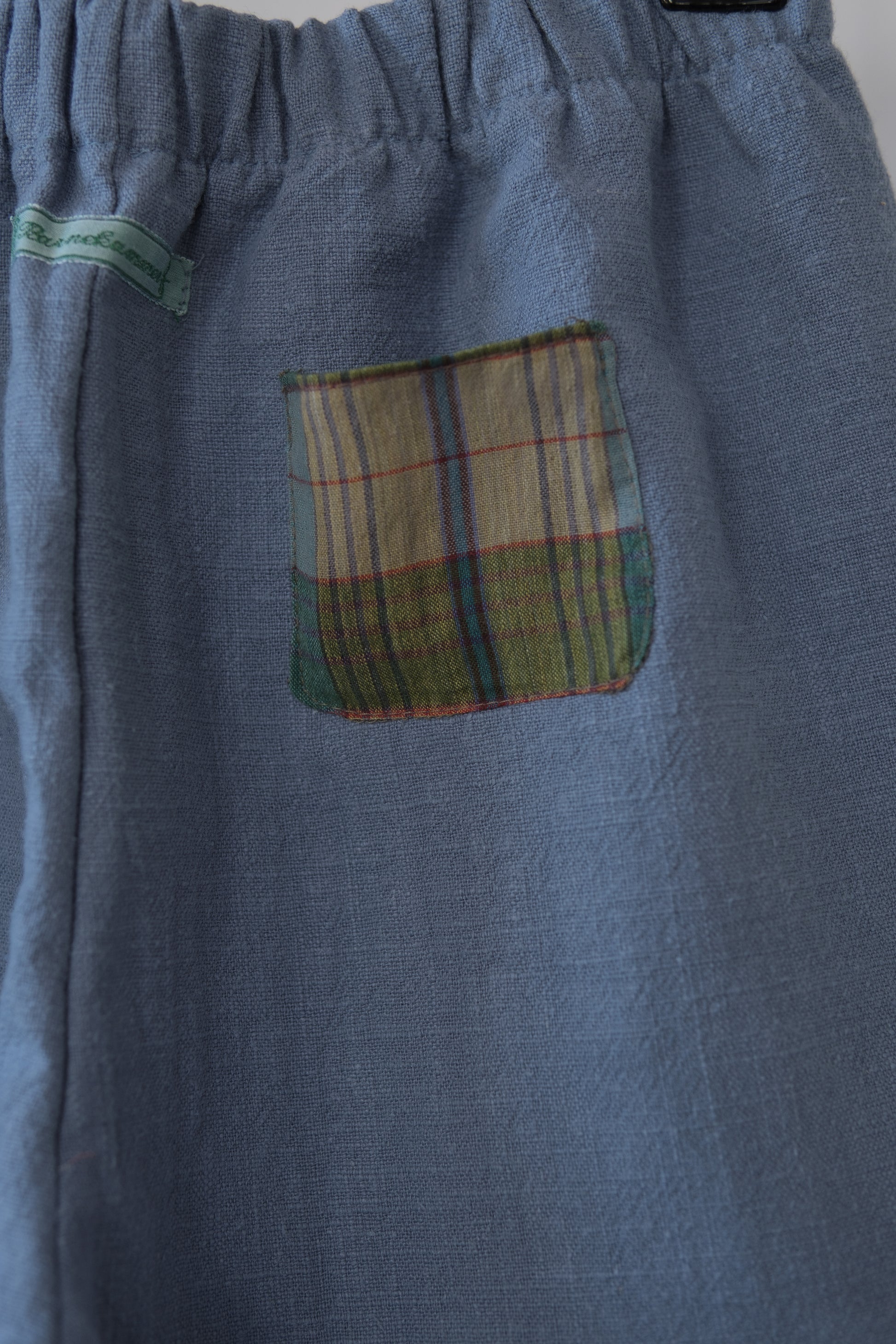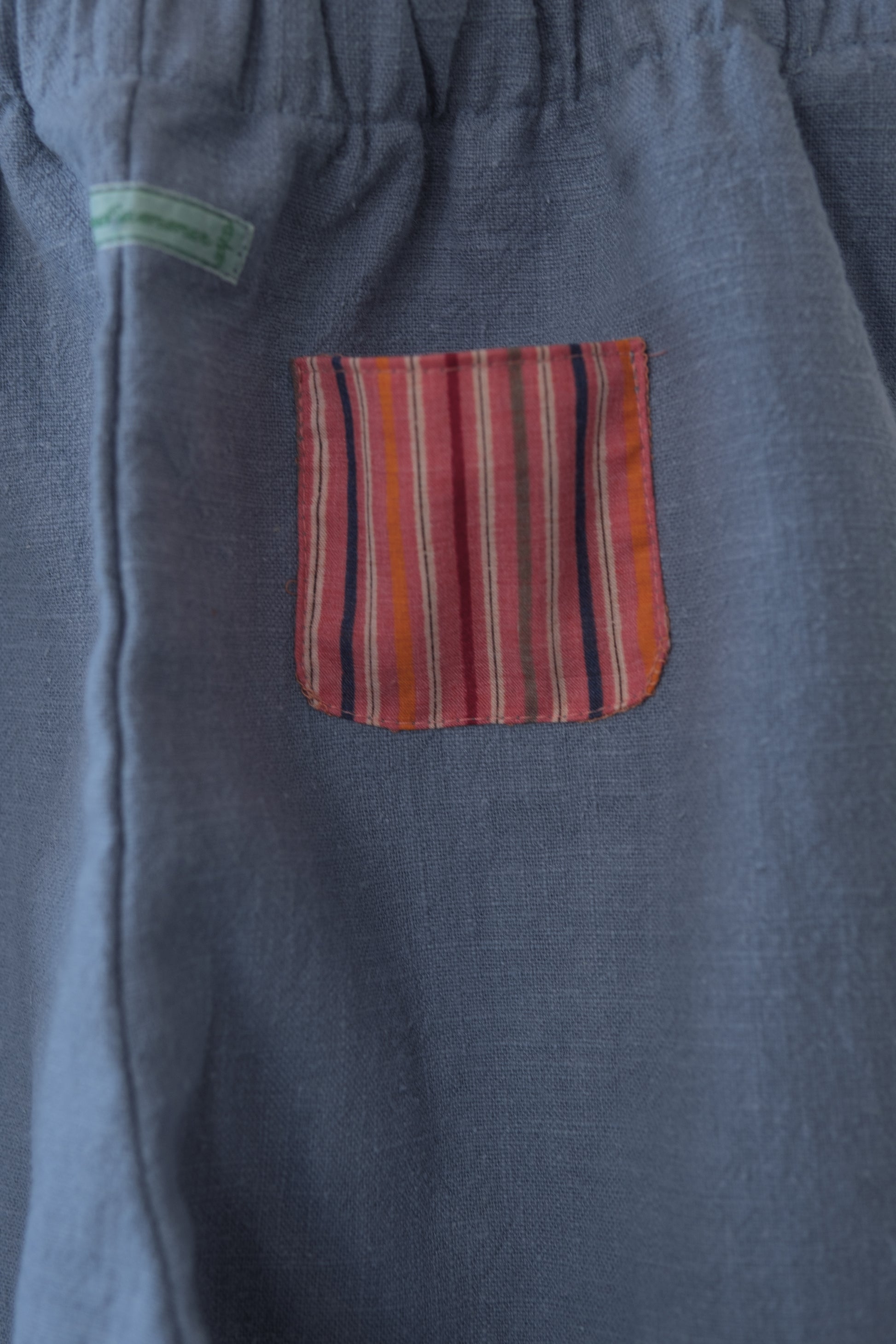 Denne håndlagde lappebuksen fra Barnekammer er sydd i København av preloved og deadstock-stoffer fra Skandinavia. Hver bukse er unik – med varierende stofftykkelser, farger og teksturer. Noen er i myk bomull, andre i slitesterkt stonewashed lin.