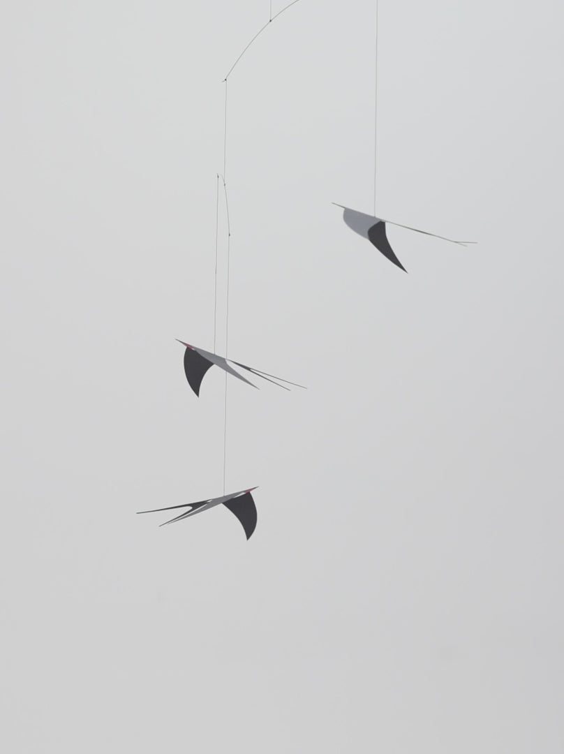 Heng denne uroen over sengen eller sofaen for å minne om svalens elegante flytur og smarte aerobatikk. Fin til nyfødttiden da babyen best ser kontraster.