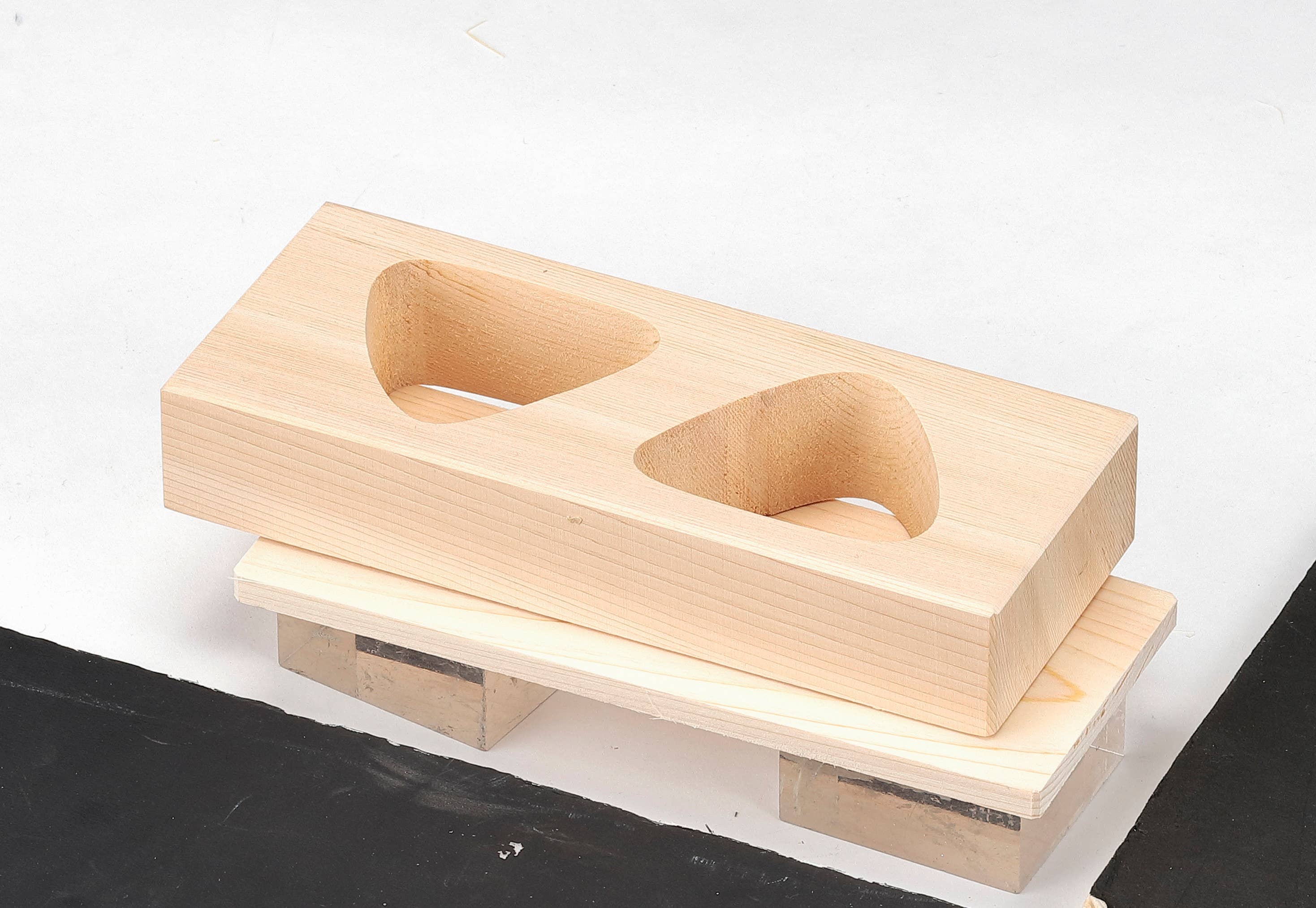 Treformer for trekantede onigiri og for motivene furu, bambus og plomme, laget av naturlig hinoki-tre (japansk sypress). Med disse formene kan du enkelt lage risballer i samme størrelse. Treverket absorberer overflødig fuktighet, noe som gir smakfulle risballer.