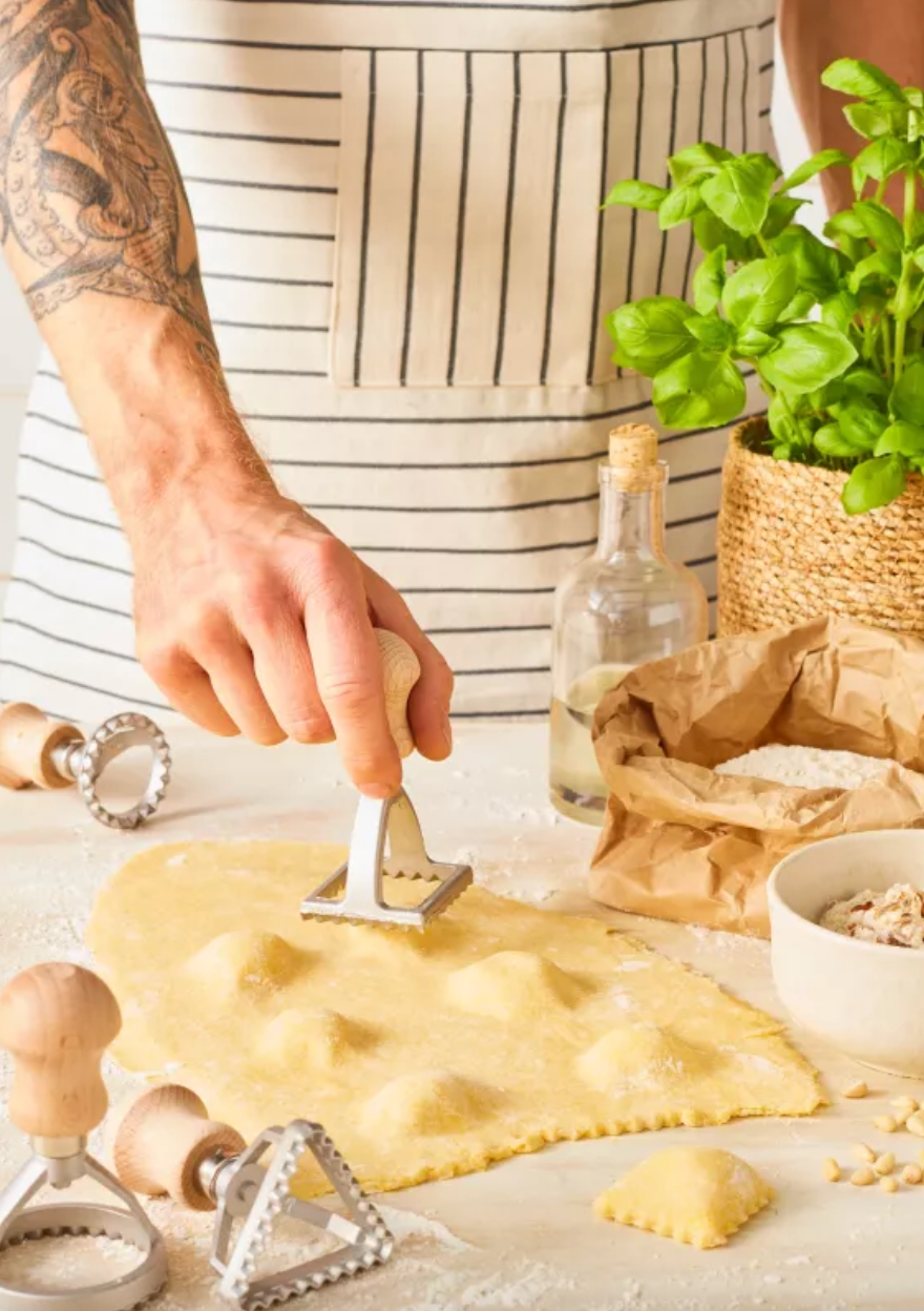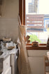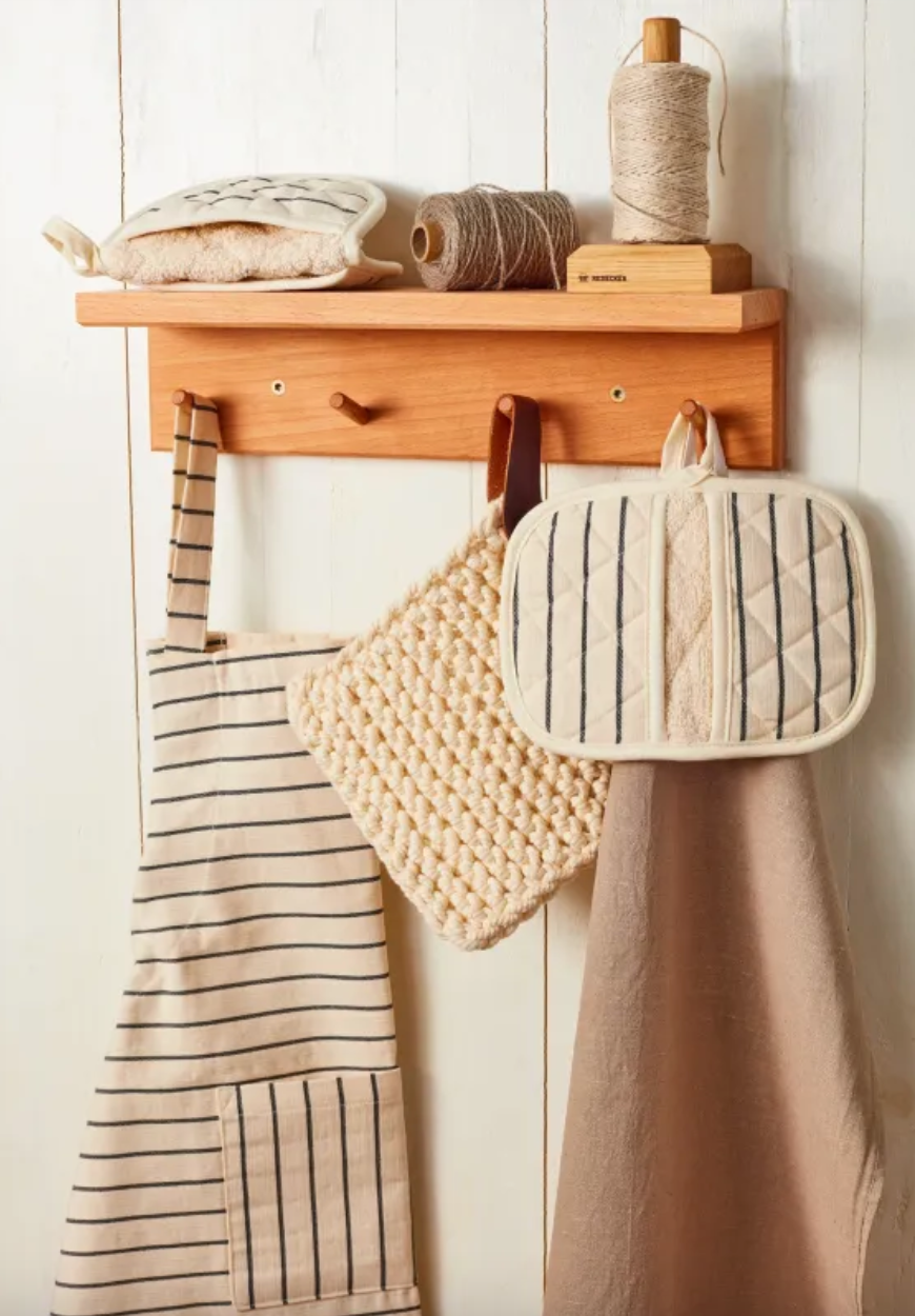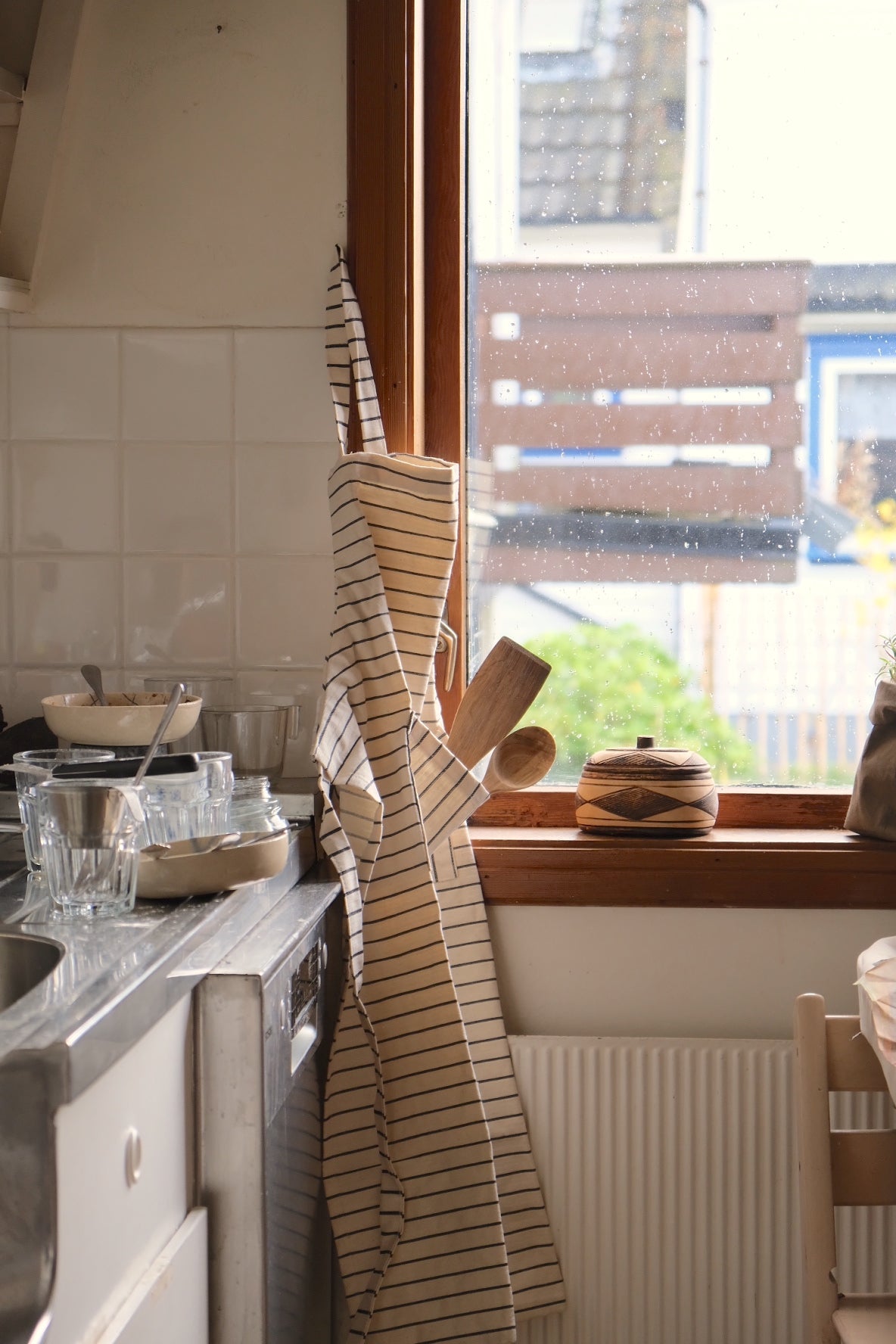 Forkle med sorte striper på kremfarget tekstil. Lommen på magen kan brukes til en gryteklut eller annet kjøkkenutstyr - kan justeres.
