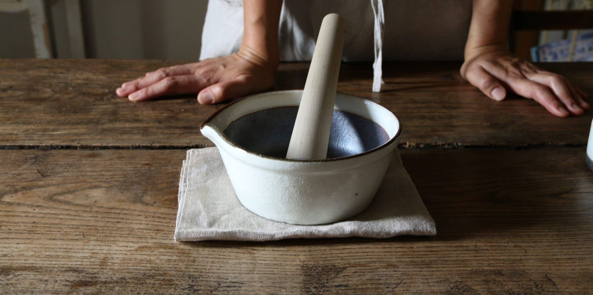 Håndlaget av høykvalitets keramikk og brent ved høy temperatur, er denne morteren både slitesterk og holdbar, samtidig som den har en jevn og naturlig tekstur. Den er utformet for stabilitet og enkel bruk.