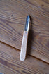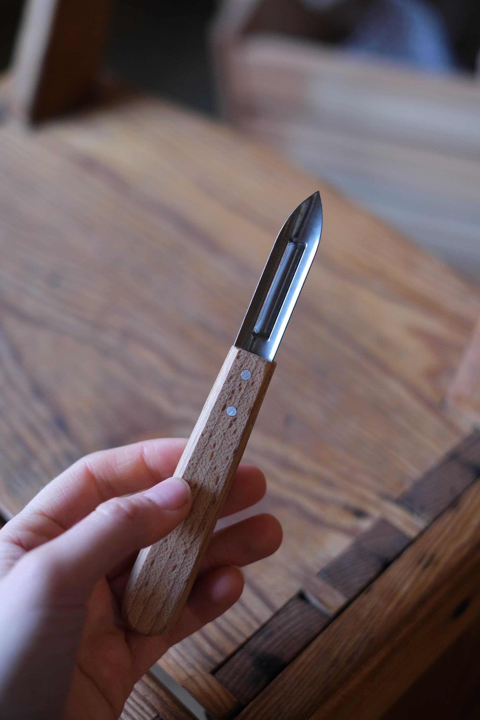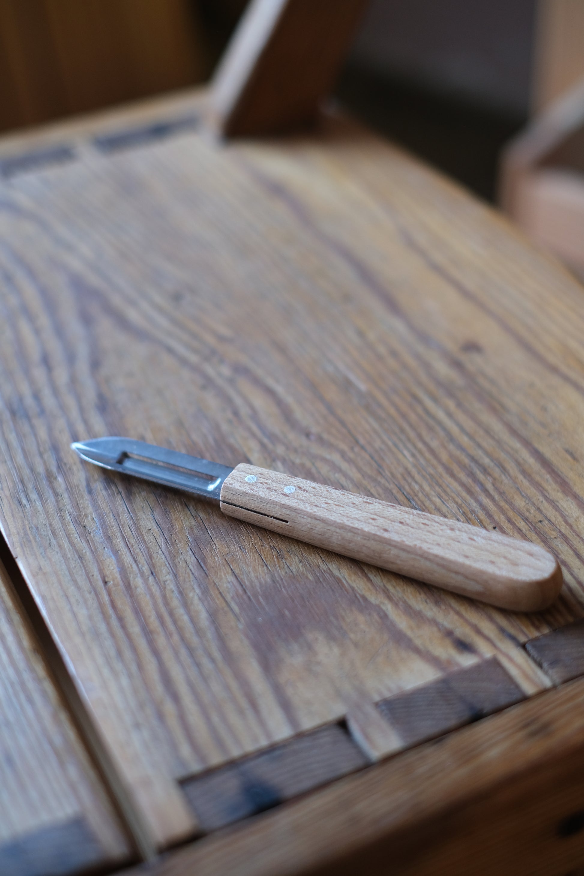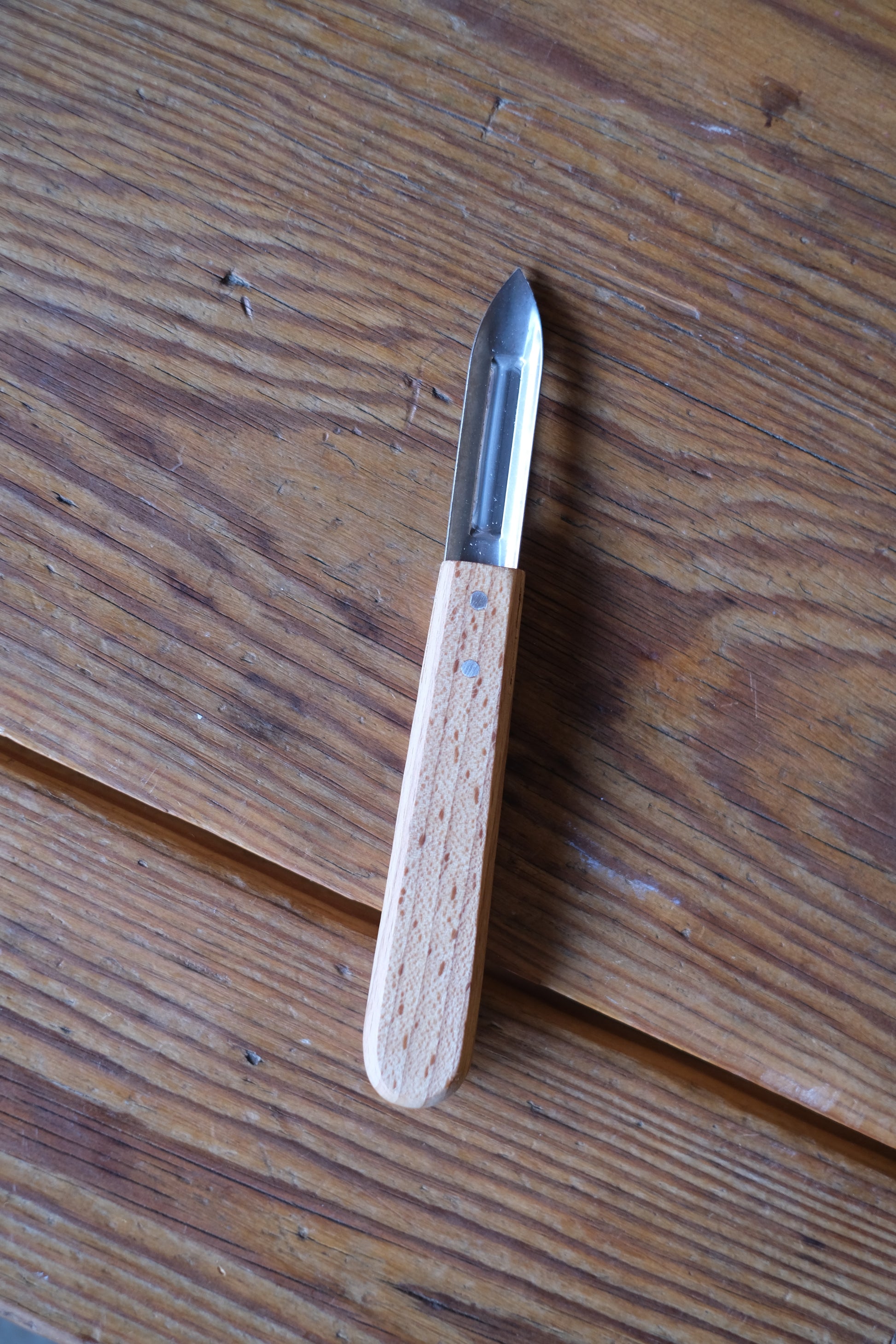 Kniv til å skrelle poteter, frukt, osv. Rustbestandig. Oljet håndtak i bøk