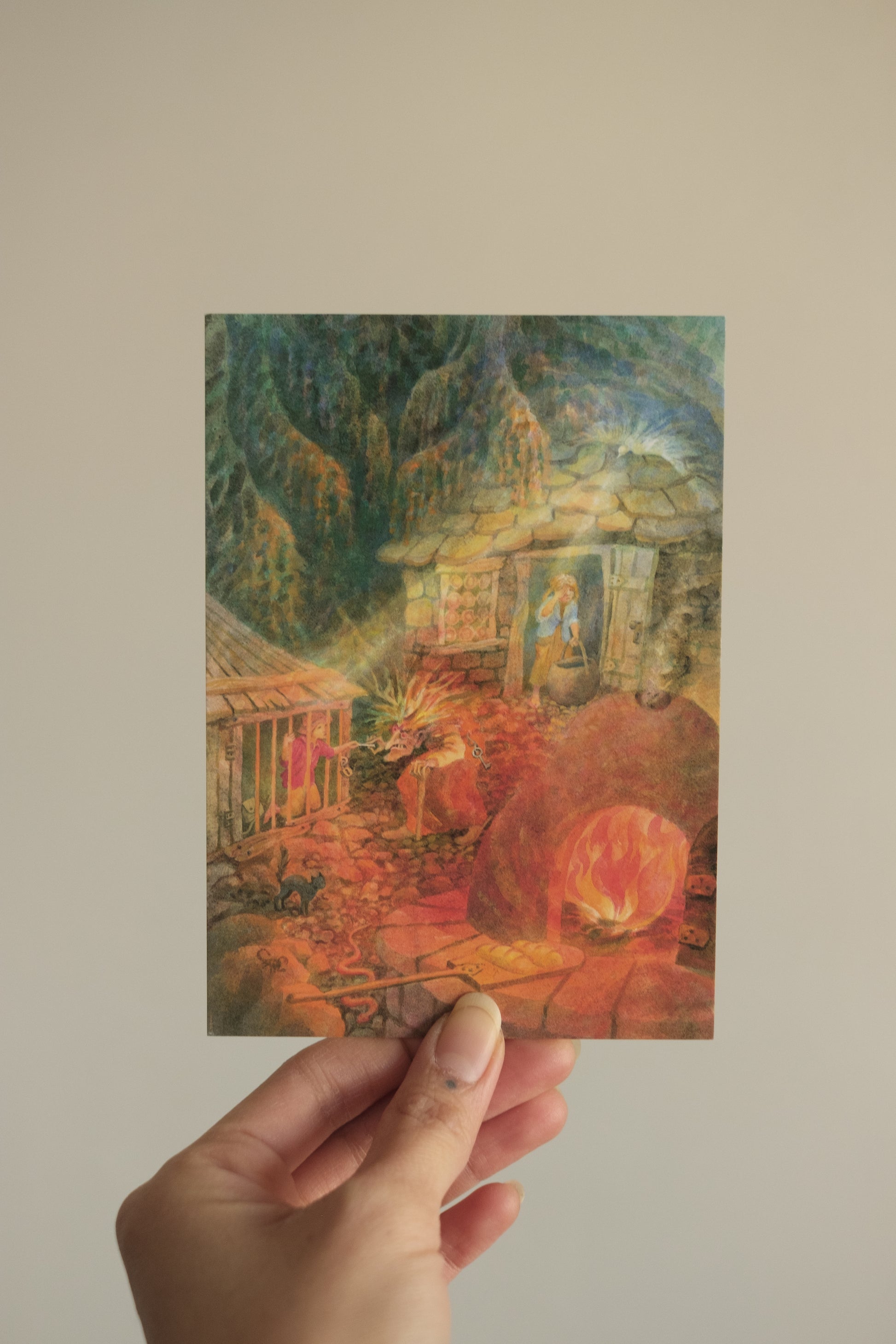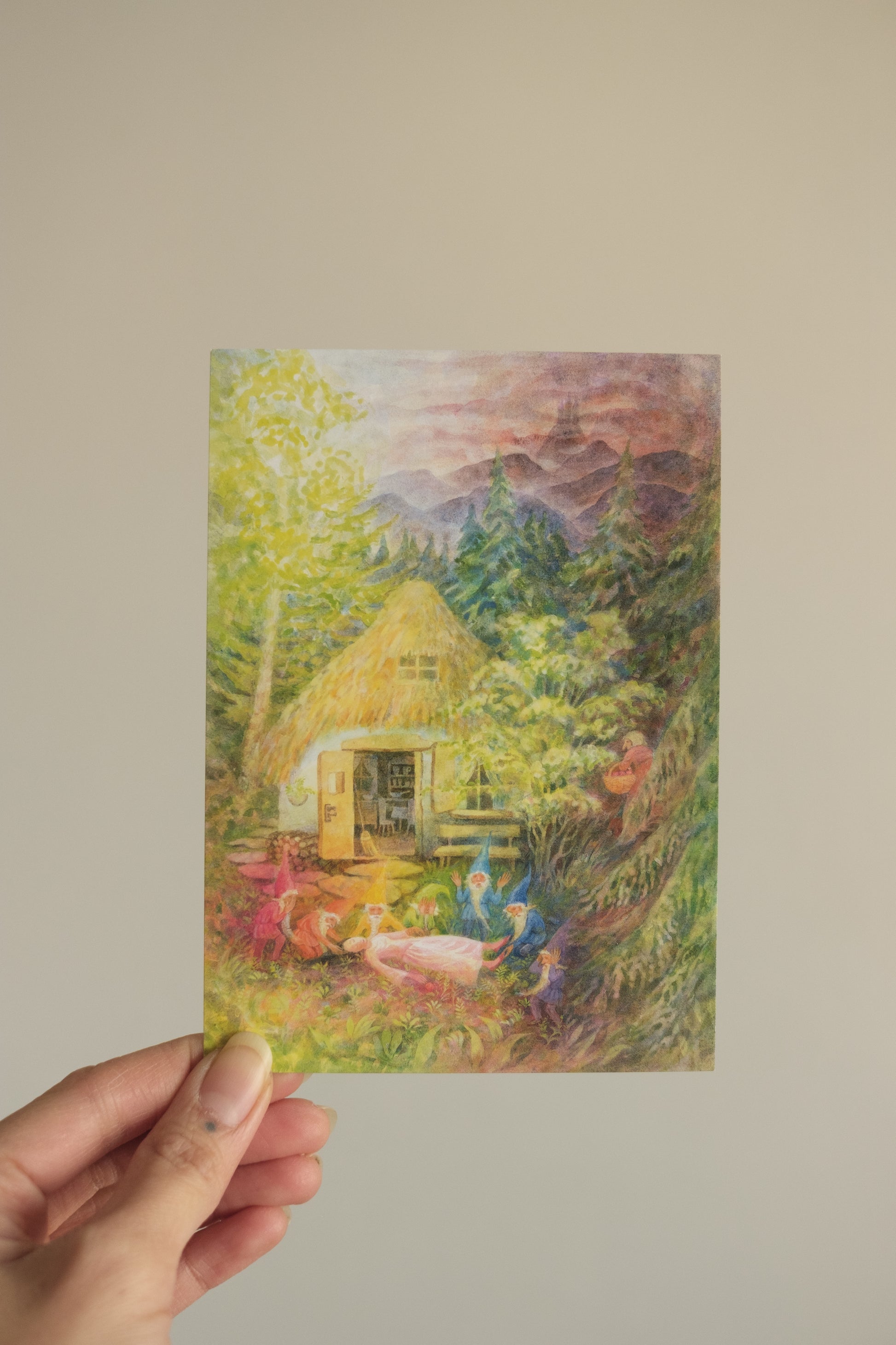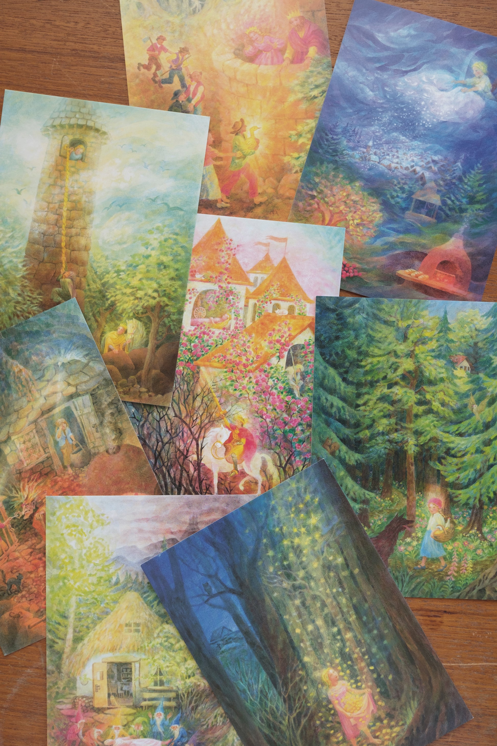 Koselige kort med motiv av eventyrfigurer fra eventyr skrevet av brødrene Grimm. Superskjønne til å henge på veggen, sende til en venn eller bruke som bursdag- eller julekort.