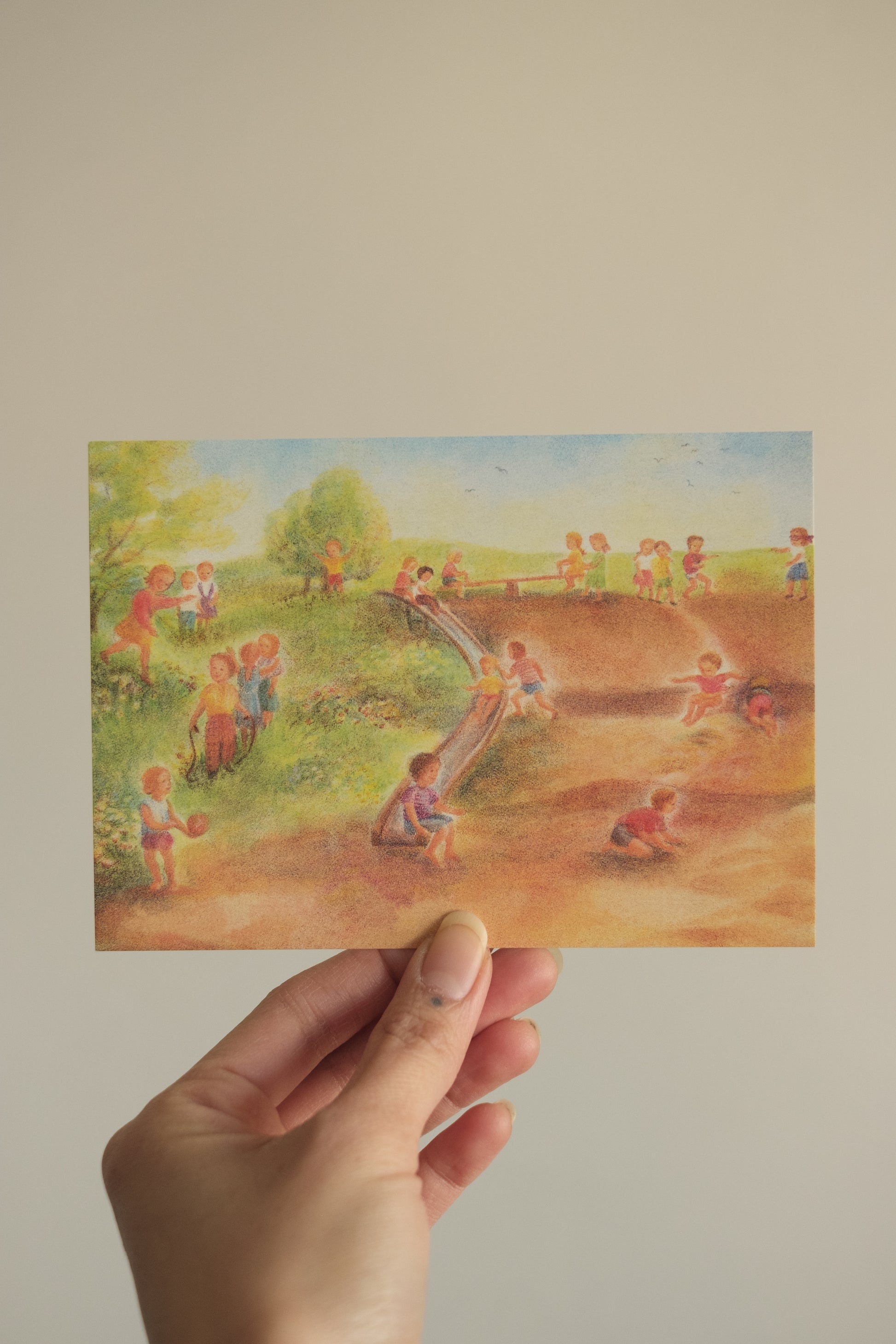 Et stemningsfullt kunstkort med motiv av Gabriela de Carvalho, hentet fra verket Kinderspiel. Bildet skildrer barn i lek ute i naturen – en livlig og varm illustrasjon som fanger barndommens fellesskap og glede.
