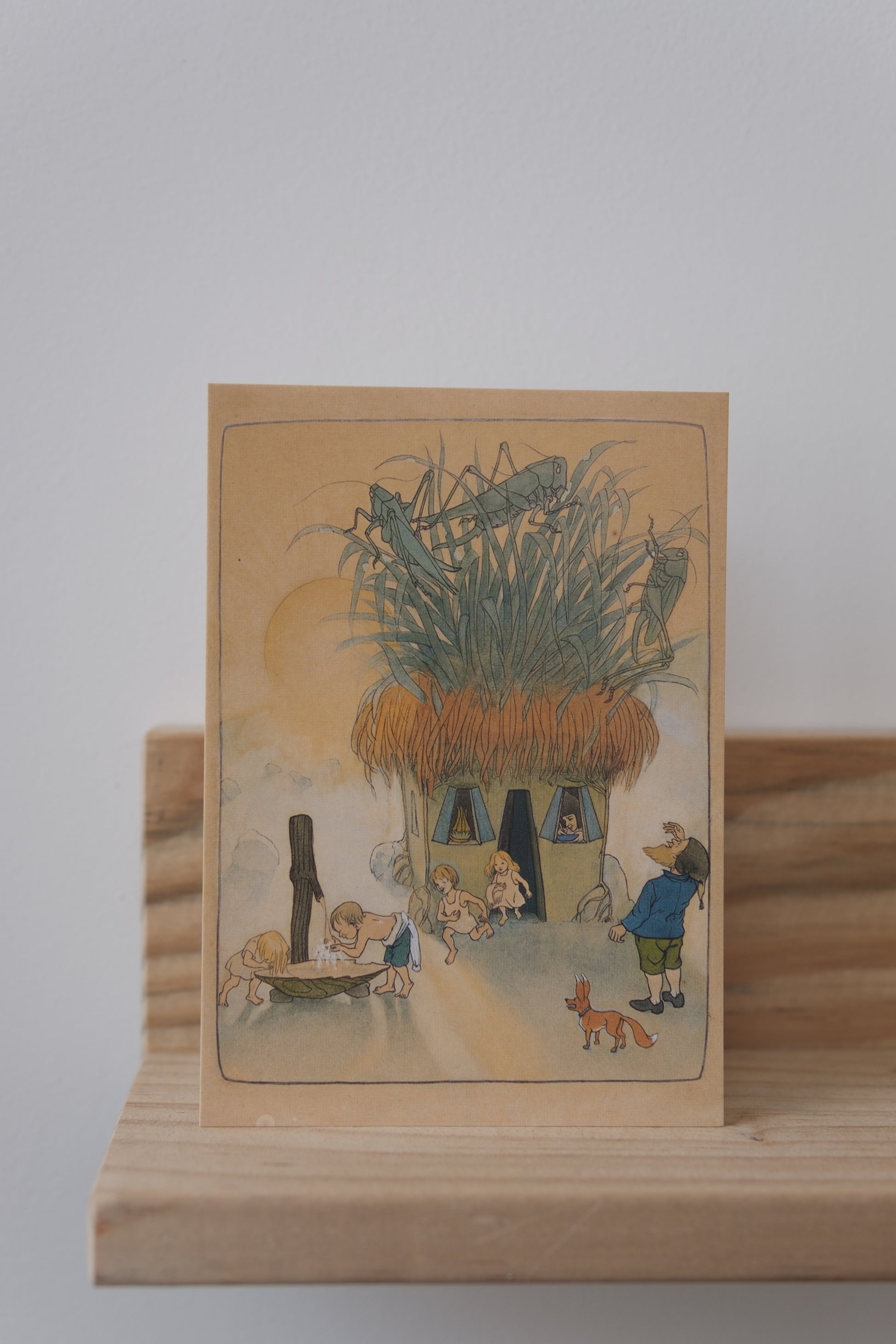 Et stemningsfullt kunstkort med motiv av Ernst Kreidolf (1863–1956), hentet fra verket Das Zwergenhaus mit drei Heuschrecken. Kreidolf er kjent for sine fantasifulle og poetiske illustrasjoner, og dette motivet viser små nisser i et lekent hus under gress og tre store gresshopper – en detaljrik og magisk scene.