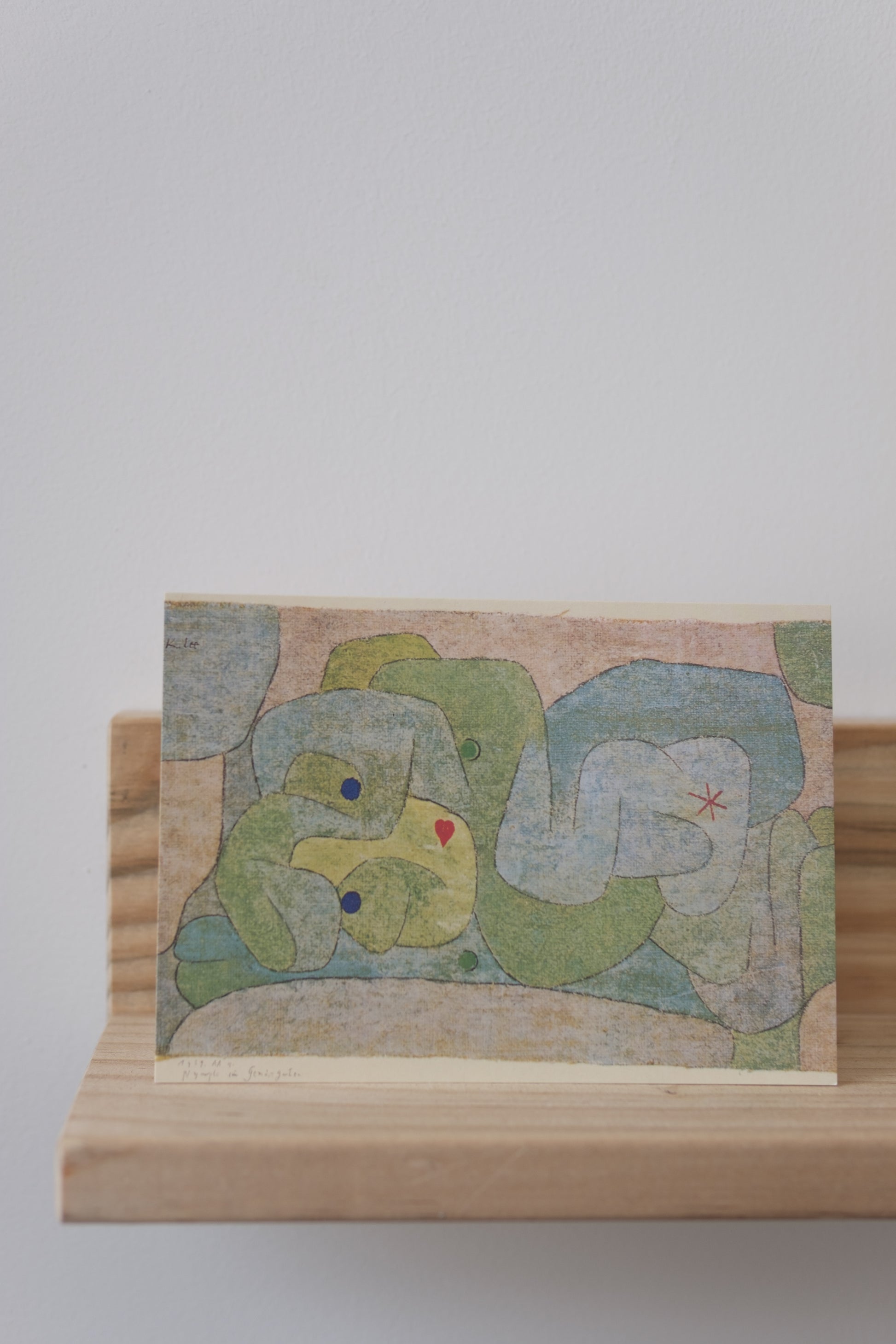 Et stemningsfullt kunstkort med motiv av Paul Klee (1879–1940), hentet fra verket Nymphe im Gemüsegarten (1939). Klee er kjent for sitt abstrakte formspråk og poetiske billedverden, og her skaper han en drømmeaktig scene hvor farger og former smelter sammen til et organisk hagemotiv.
