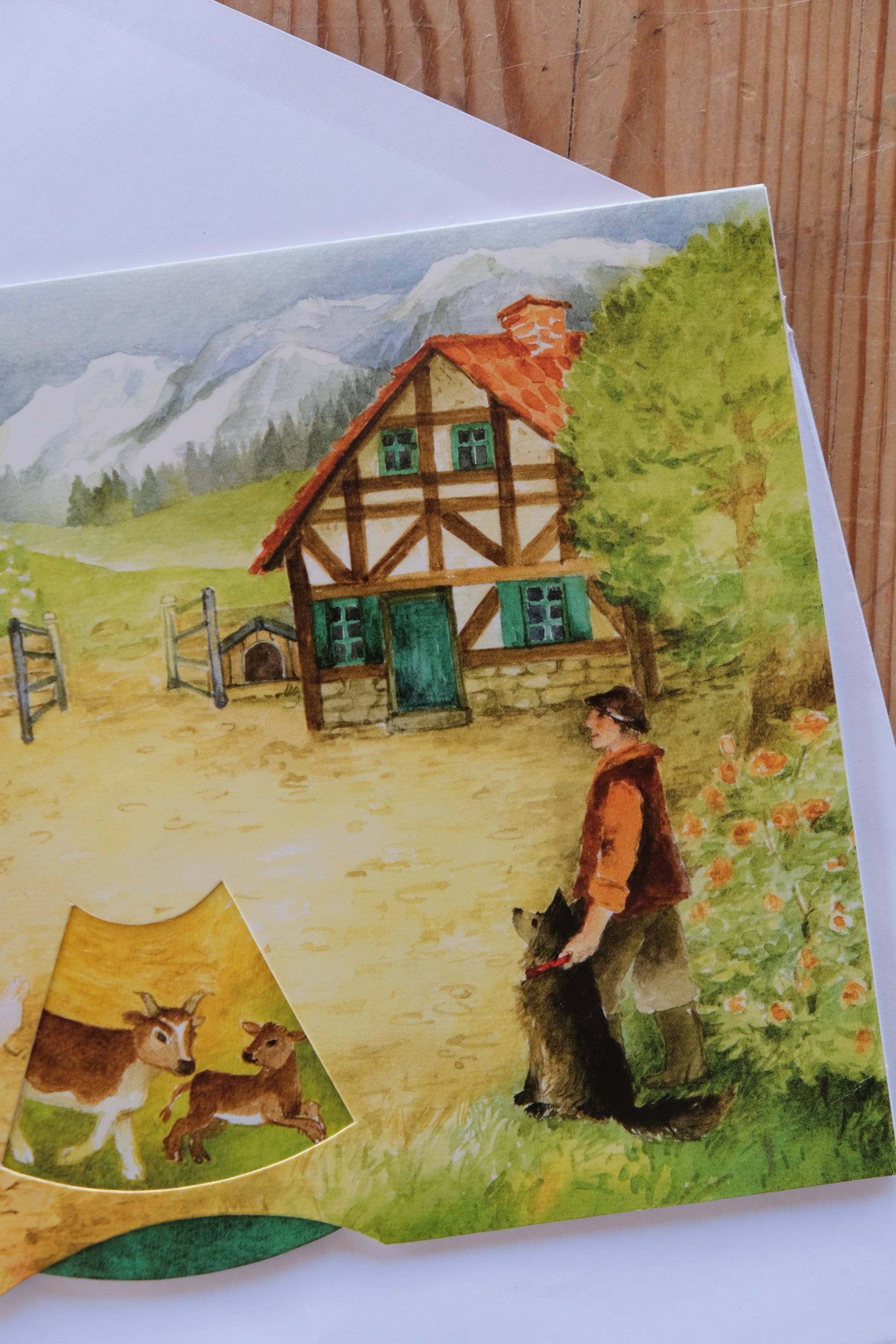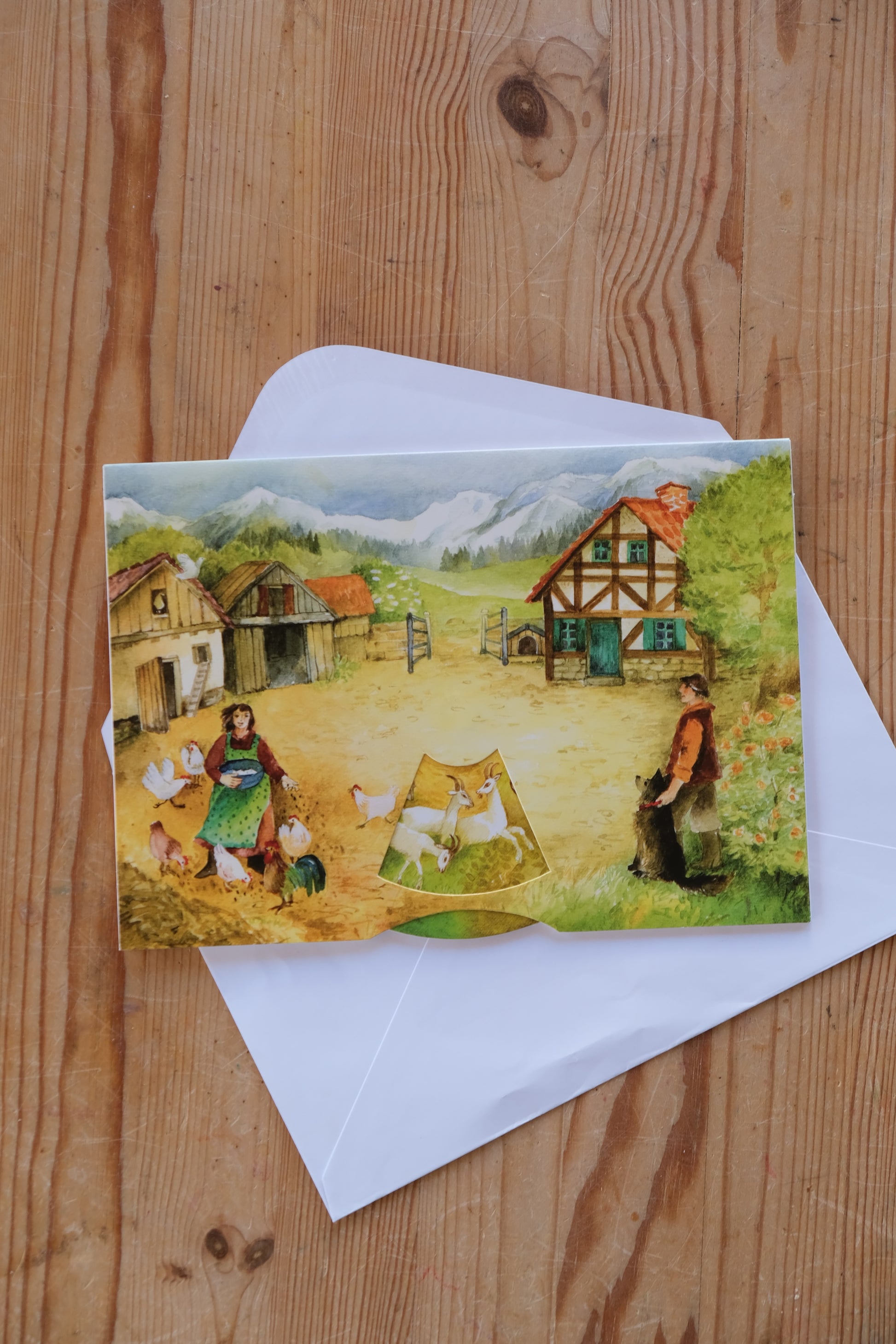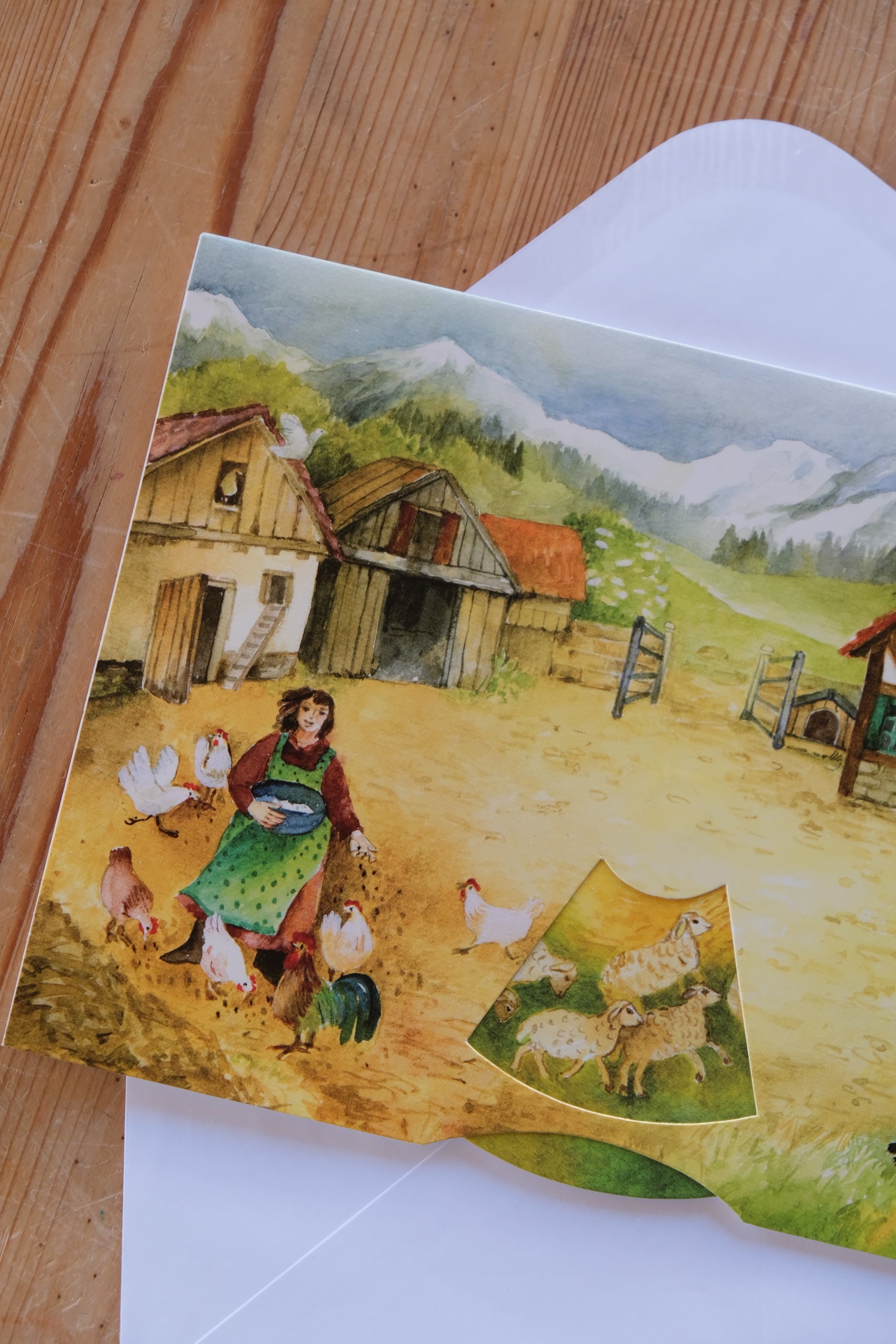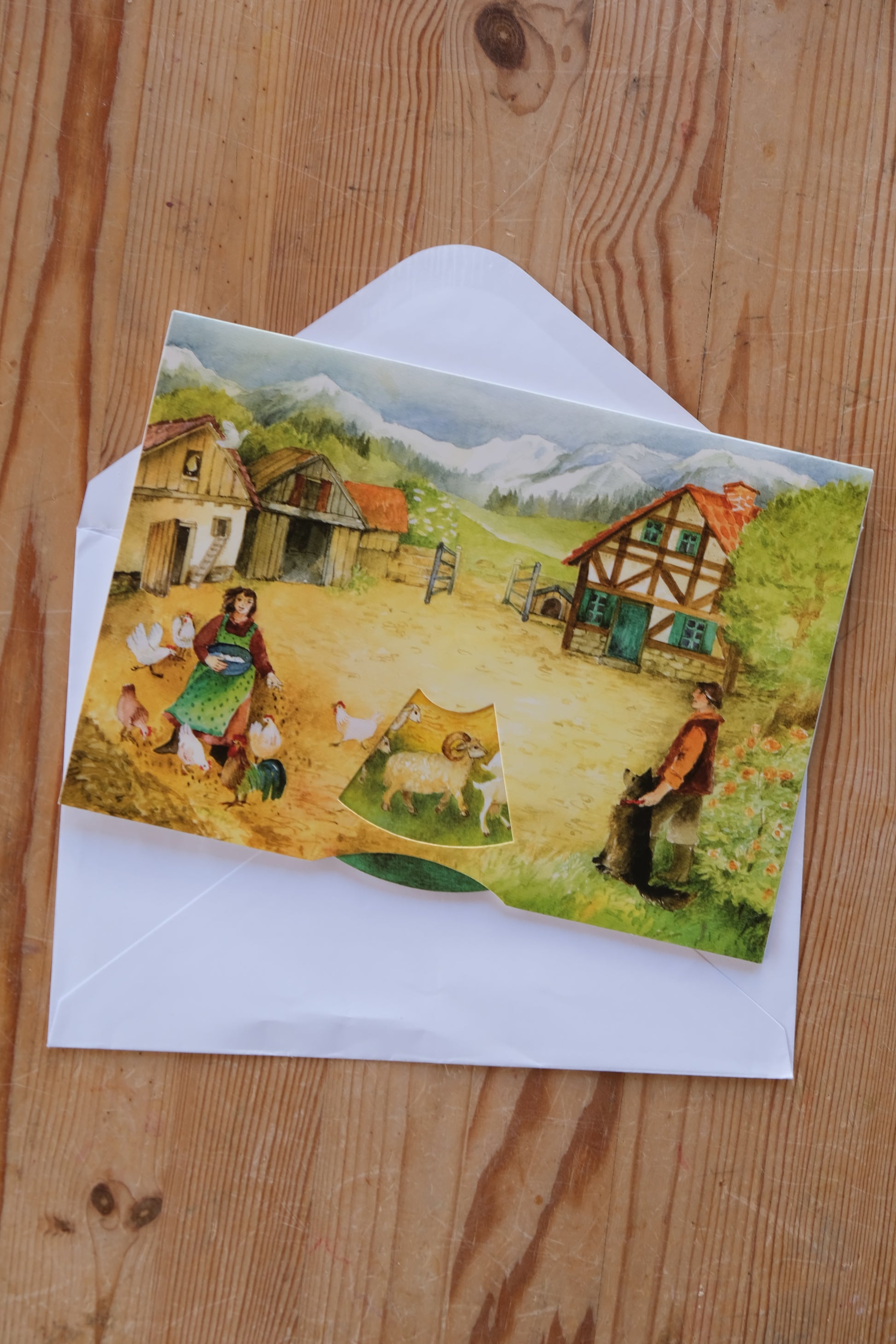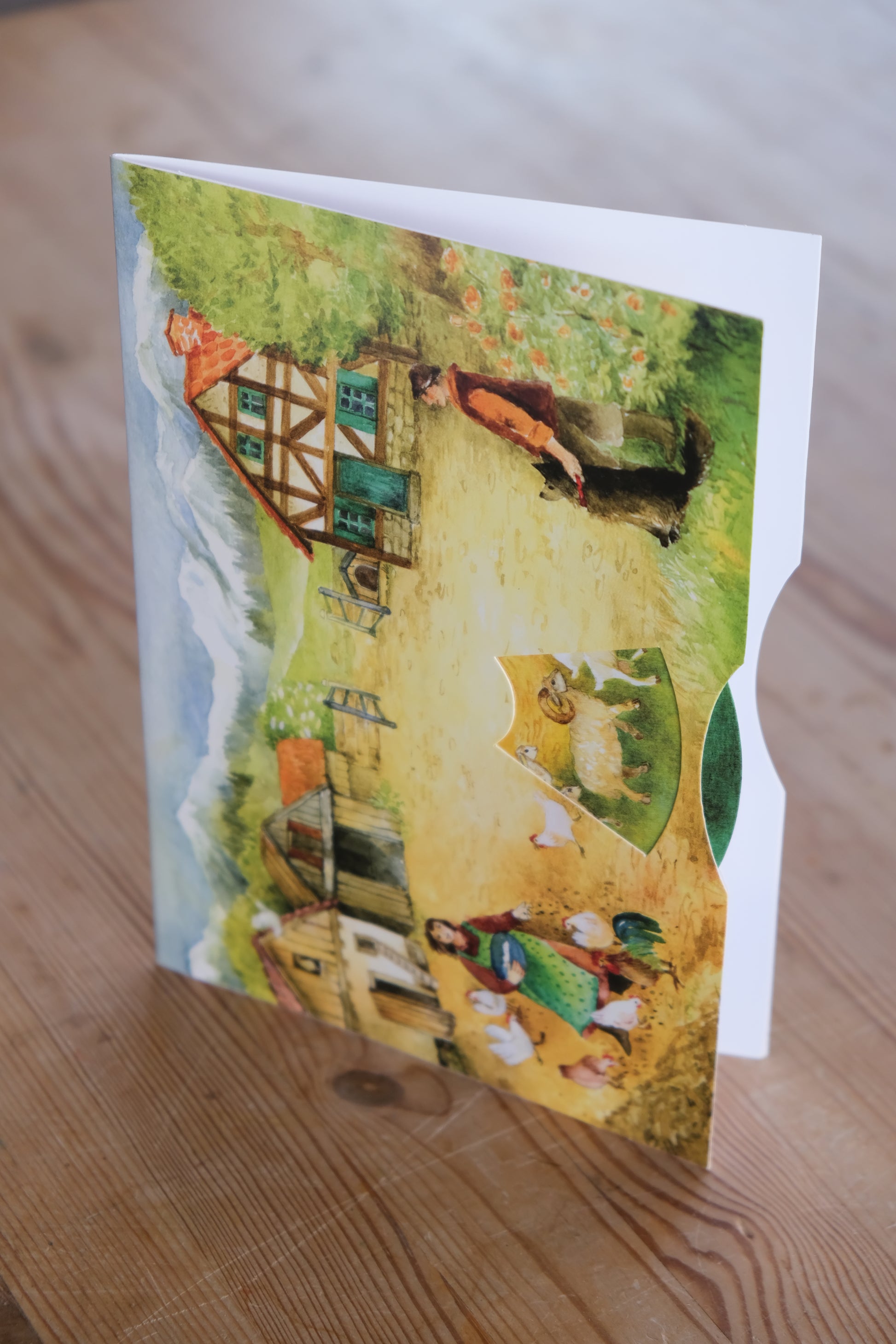 Et helt spesielt dobbelkort hvor motivet kommer til liv når du snurrer på hjulet. Se dyrene vandre gjennom gårdstunet!