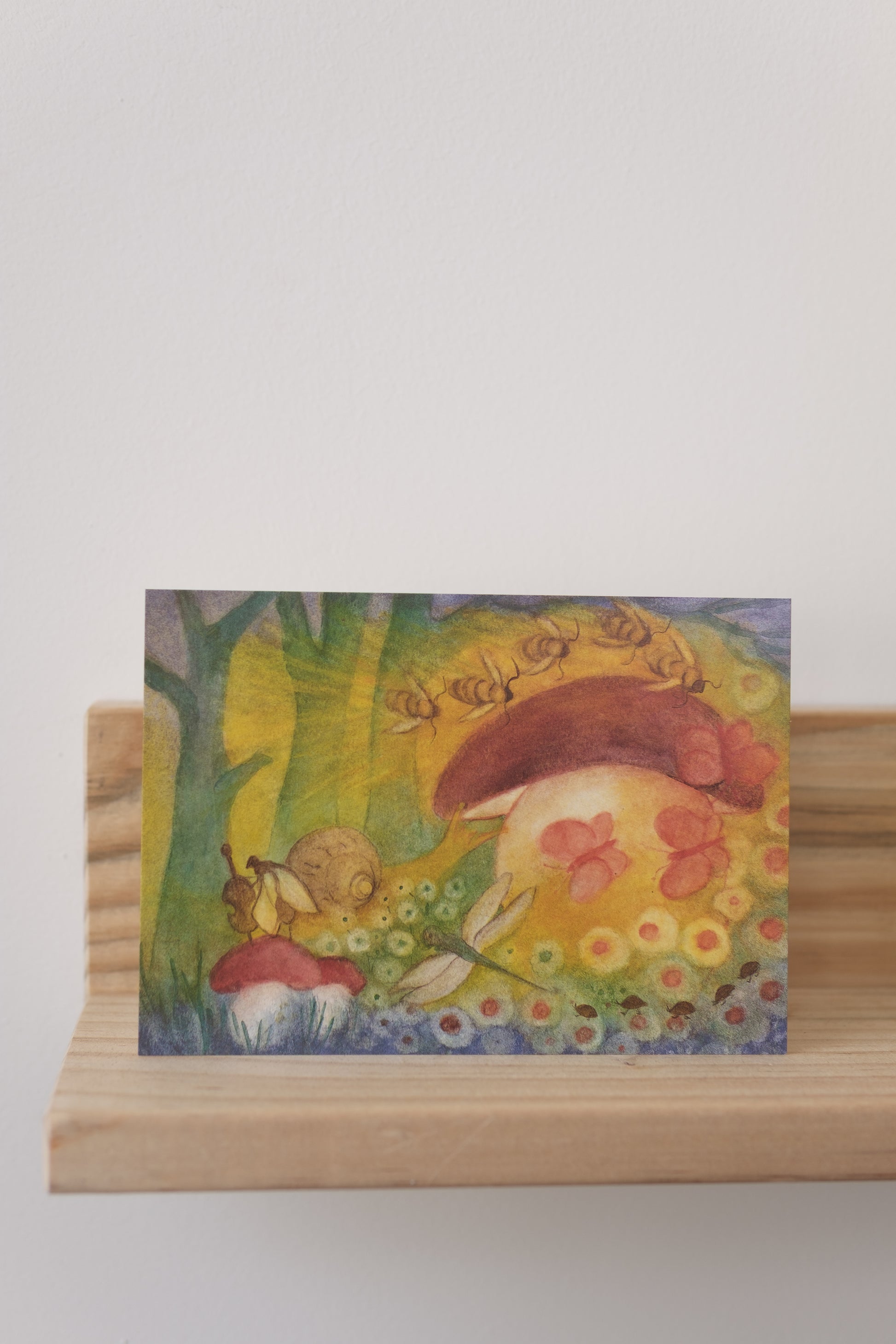 Et stemningsfullt kunstkort med motiv av Jula Scholzen-Gnad, hentet fra serien Sommerfest im Walde. Bildet viser en detaljrik og poetisk skildring av skogslivet, med små skapninger samlet rundt en rød fluesopp – en magisk scene fra naturens eventyrverden.