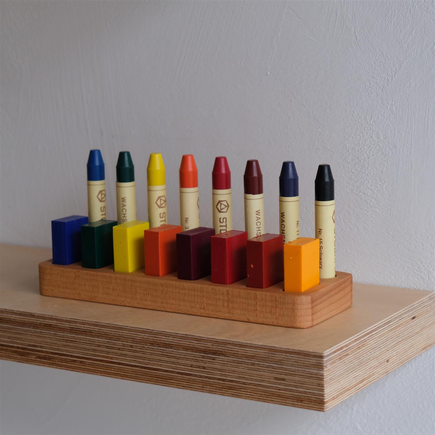 Håndlaget stativ i bjørk til fargestifter og blokker, det er plass til 8 + 8. Med denne holderen kan barn rydde alt fint på plass, og de står fint på bordet elleri hyllen.