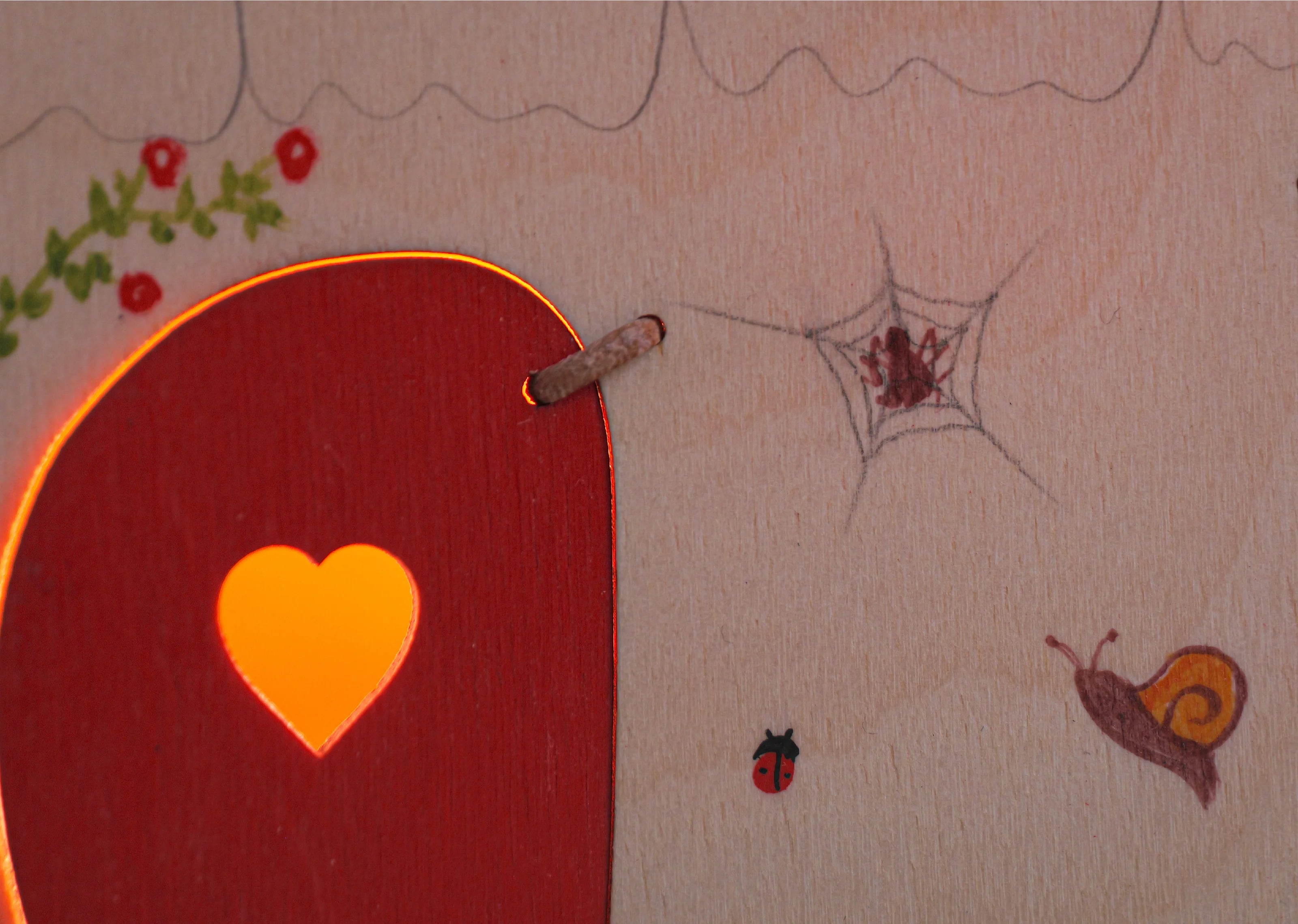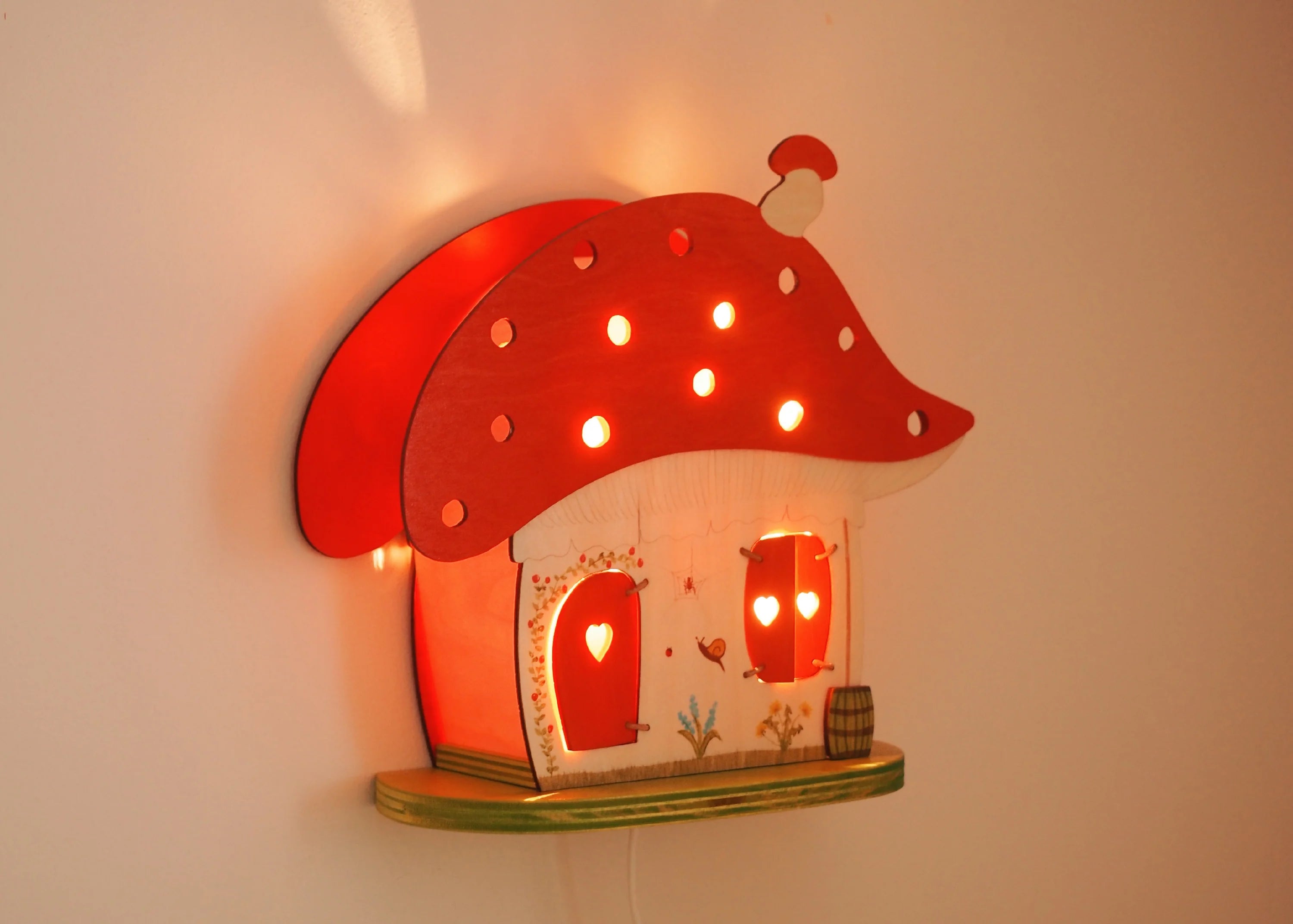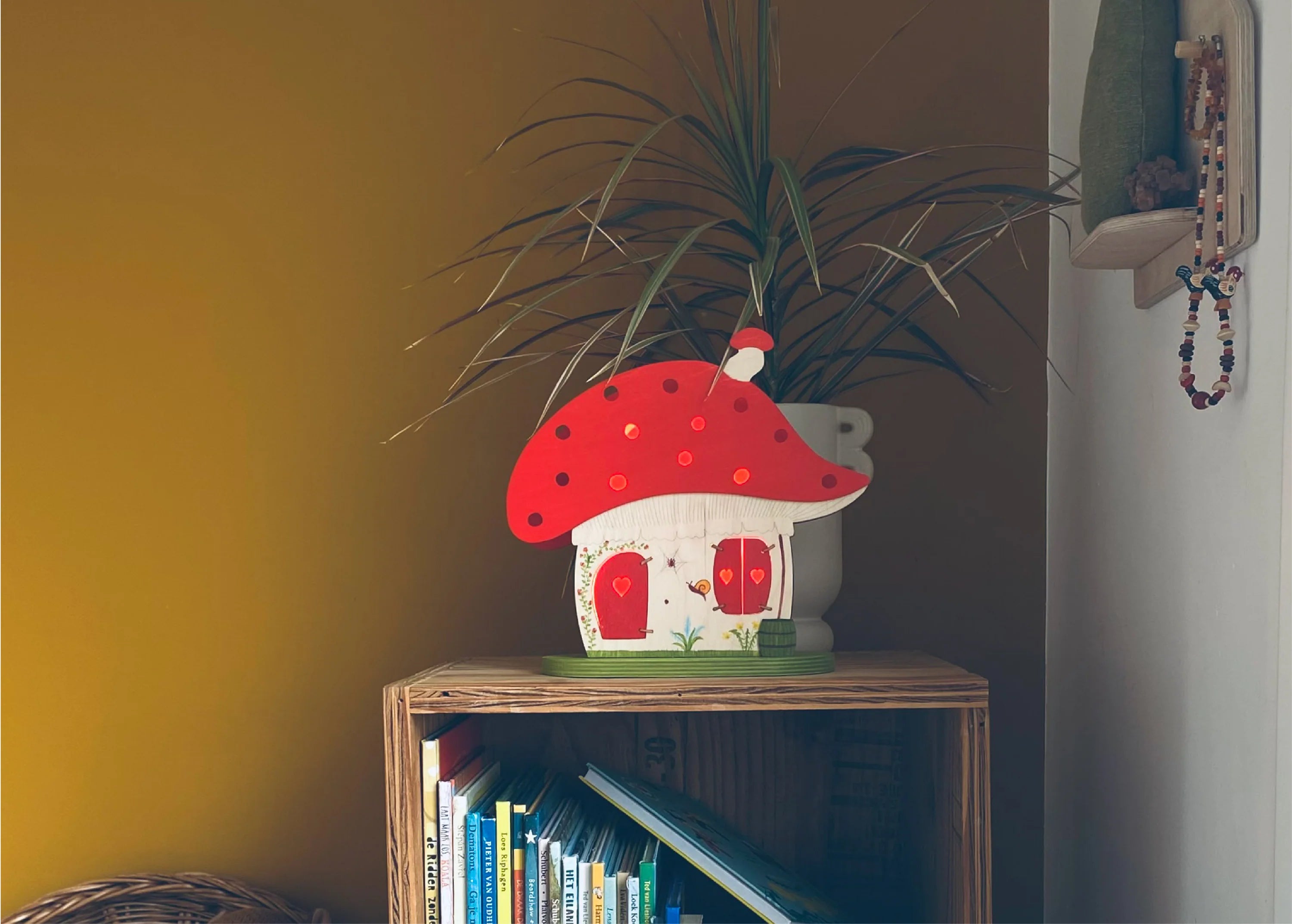 Hver lampe er laget for hånd med stor omtanke. Hvert kronblad og hvert lite dyreben blir nøye malt, og vinduer og dører er knyttet sammen med lærreimer. Resultatet er et stemningsfullt lampelys som bringer varme og eventyr inn i rommet.