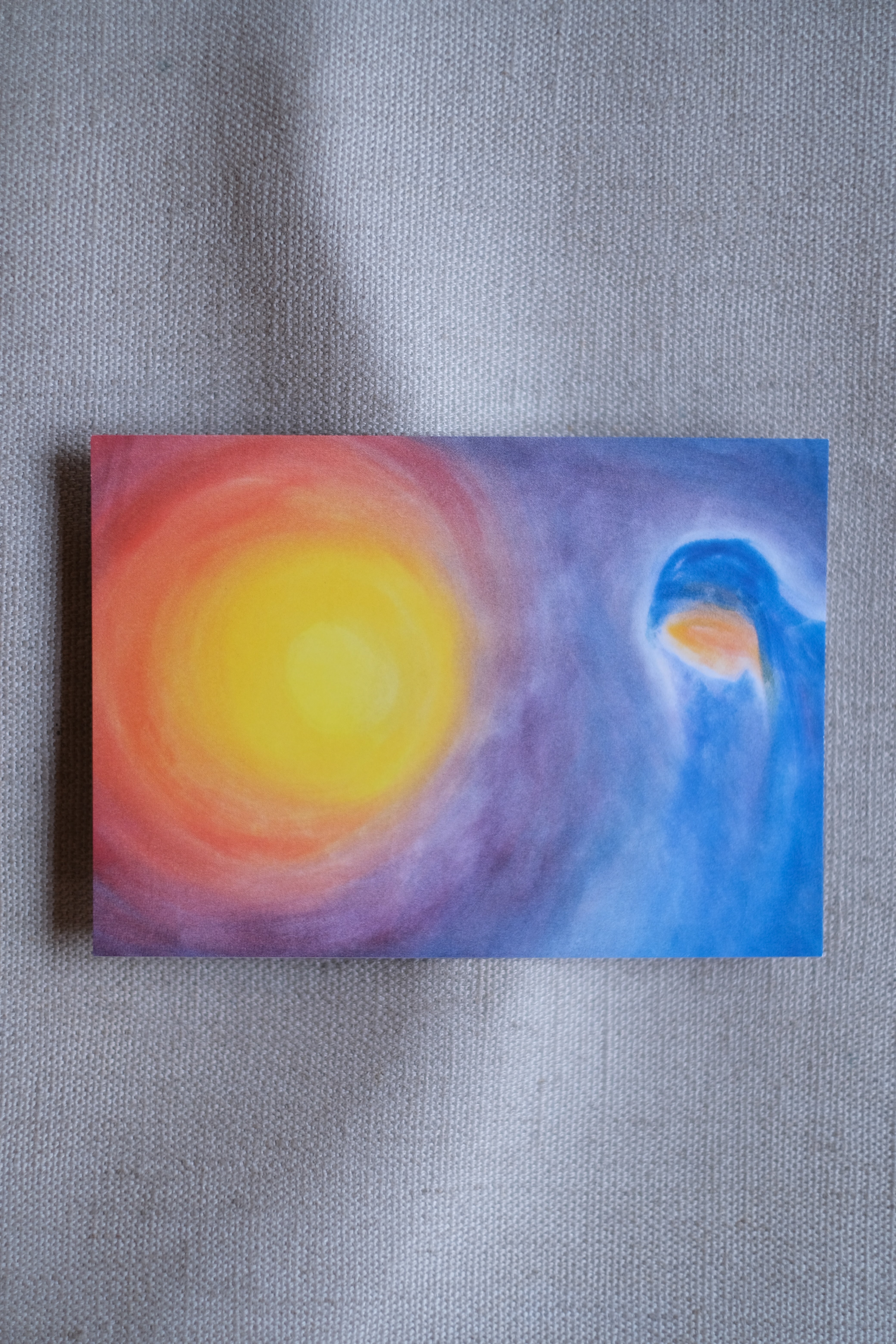 Et stemningsfullt og symbolrikt kort som skildrer øyeblikket da engelen bringer budskapet til Maria. Lyset og fargene formidler håp og stillhet – et vakkert kort til jul eller som en varm hilsen året rundt.