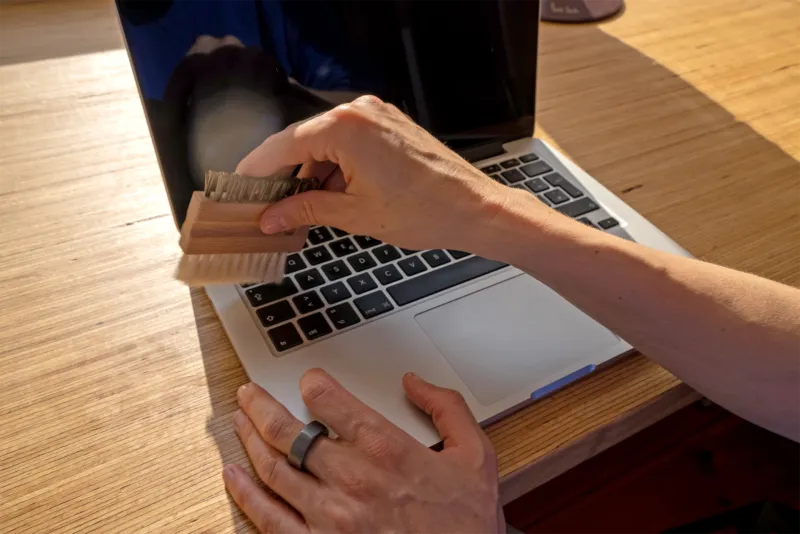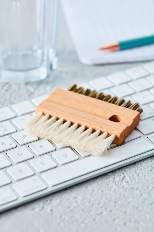 En smart og effektiv børste for et rent arbeidsområde. Den myke siden fjerner støv fra skjerm og tastatur, mens den stivere siden er ideell for å komme ned mellom tastene der smuss samler seg. Laget i oljet bøk med naturbust i to tykkelser – et funksjonelt og mer miljøvennlig alternativ til engangsprodukter og trykkluft.