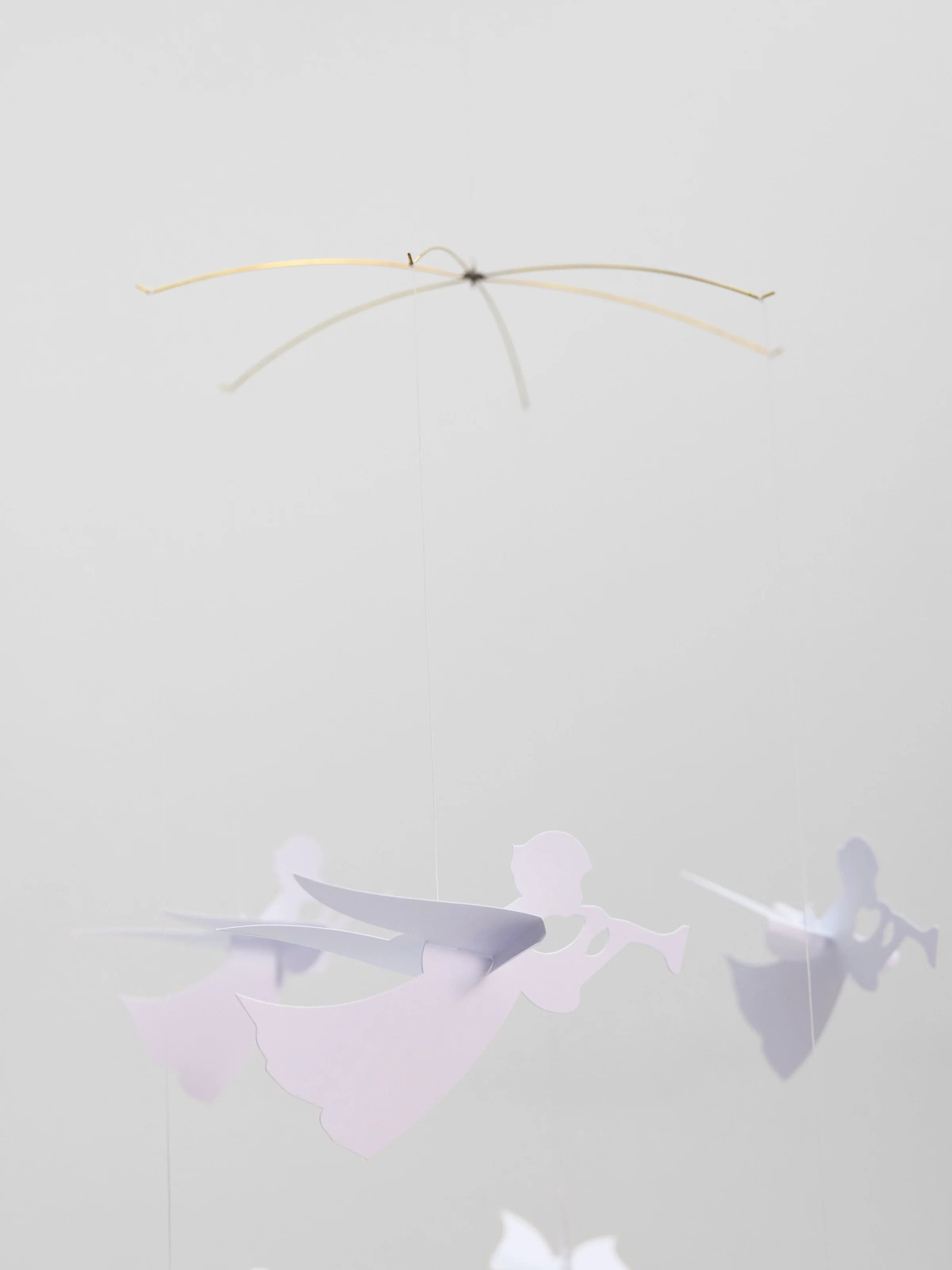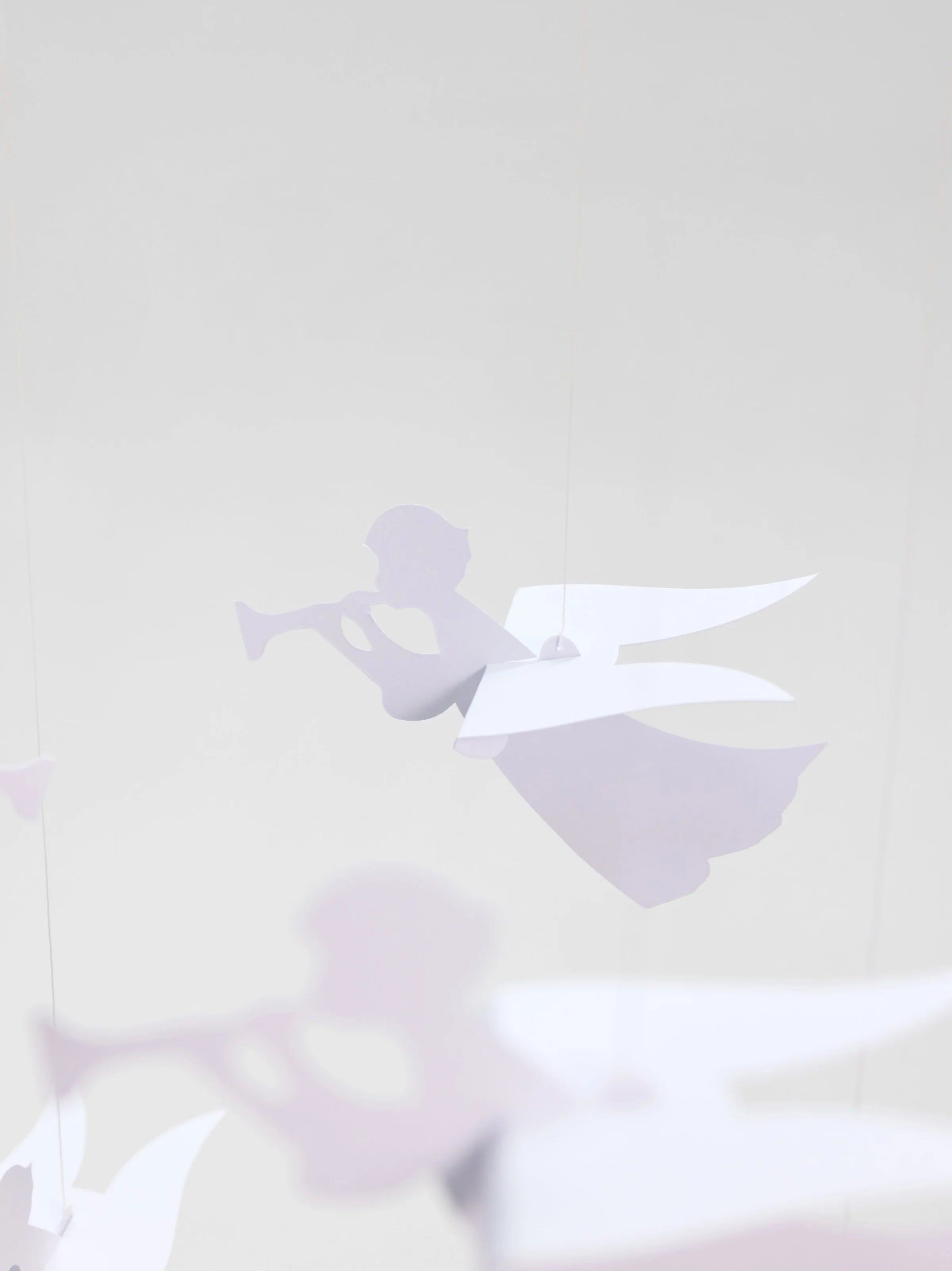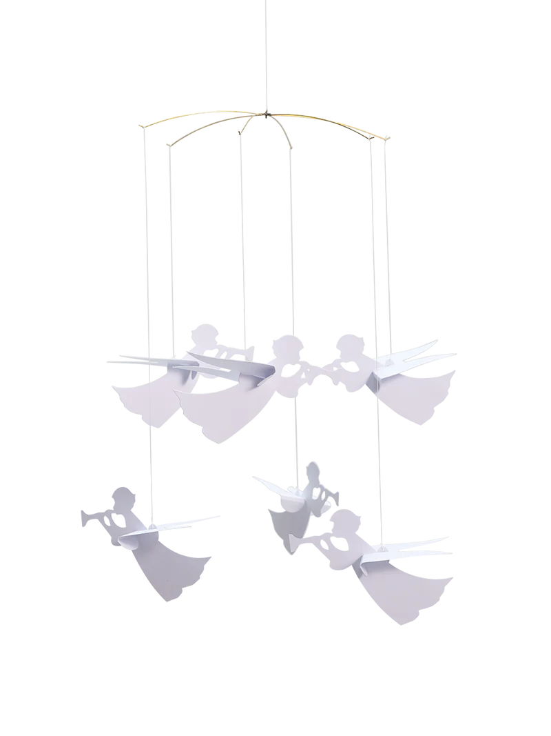 En vakker og tradisjonell julemobil med seks hvite engler. Mobilen har et enkelt grafisk uttrykk, som vil være en vakker dekorasjon i ethvert hjem.