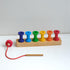 Finmotorisk leke. Dette lille trådspillet er veldig allsidig i sine lekemuligheter: Først kan barn stable og deretter øve på å tre. Hvis de kjenner fargene, kan de sortere og stable spolene på de fargede dyblene. Spolene er også ideelle for sortering og bygging med trekulene og regnbuene.