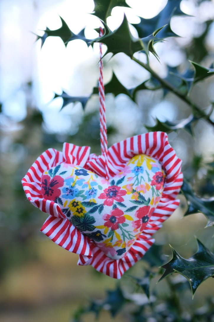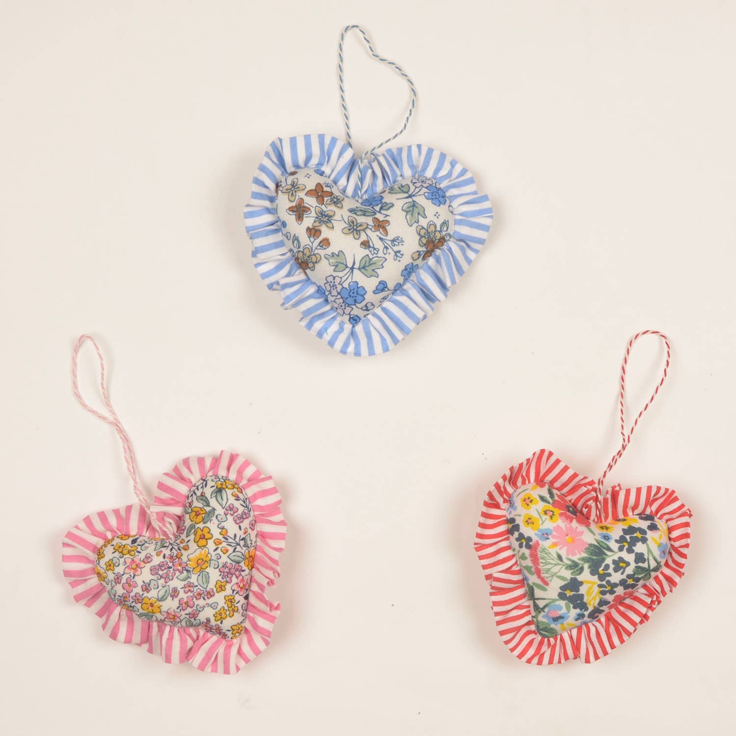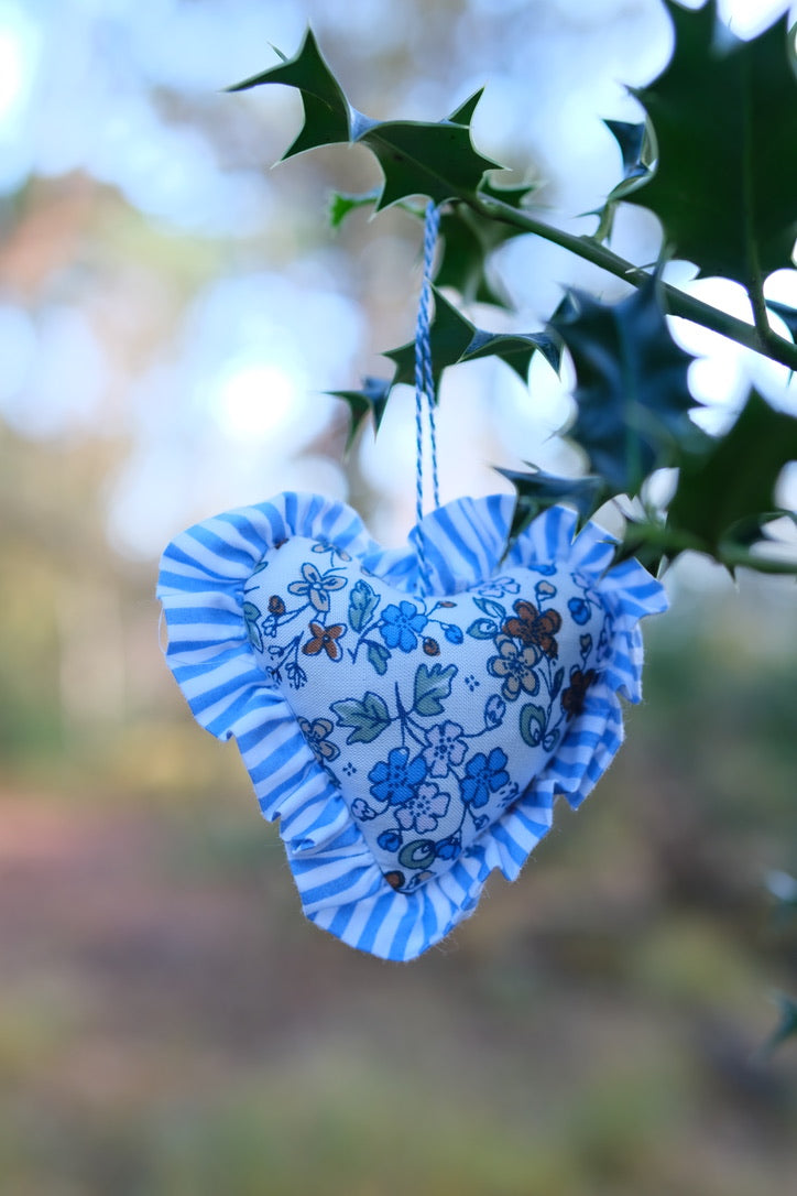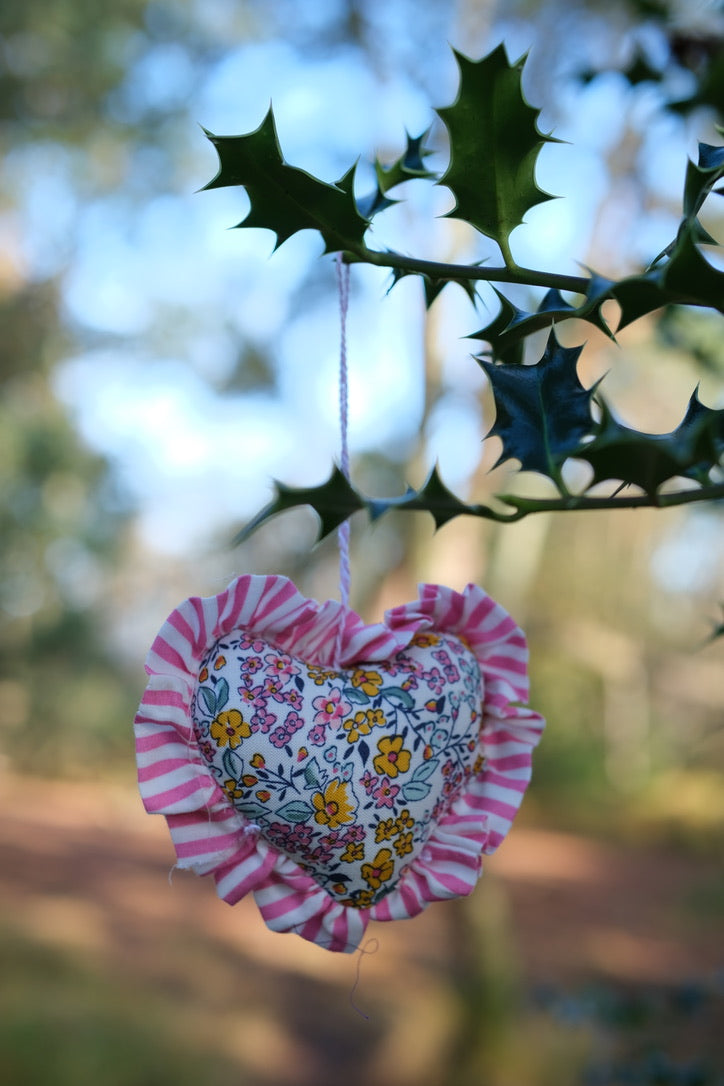 Hjerte med rysjekant - håndlaget av gjenbrukt tekstil