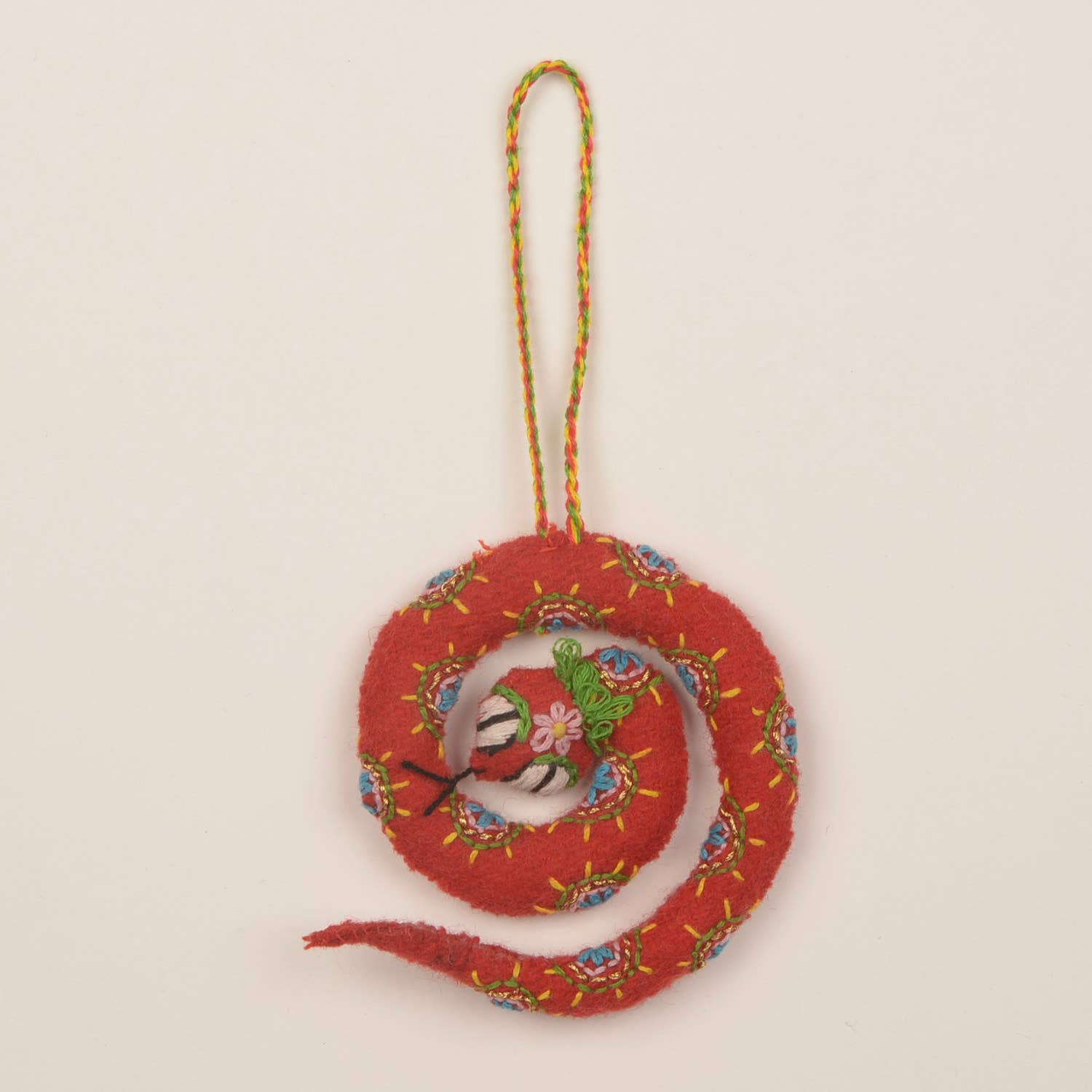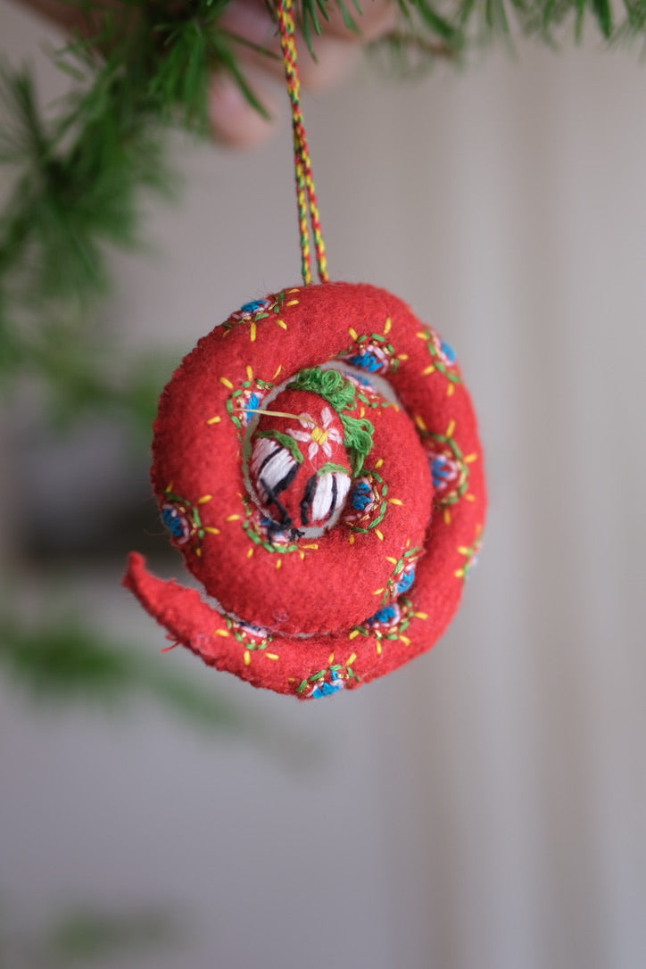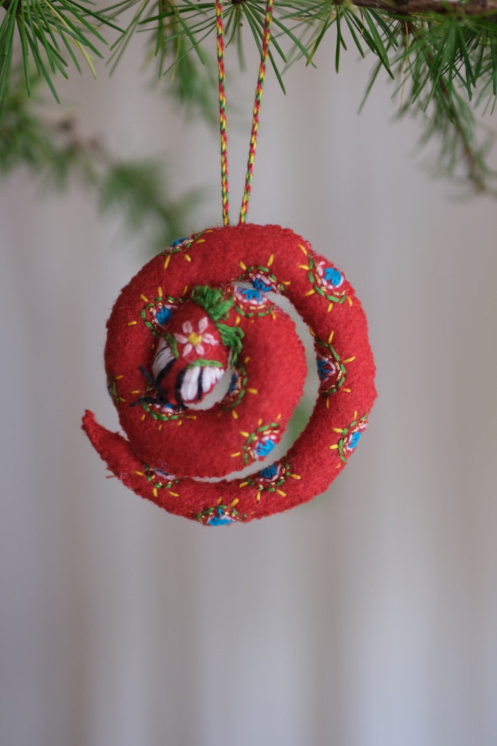 Vakker, håndlaget pynt med spiralform i varme farger. Laget av afghanske kvinner gjennom Silaiwali - et sosialt prosjekt som gir arbeid og verdighet til flyktninger.