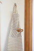 Forkle med sorte striper på kremfarget tekstil. Lommen på magen kan brukes til en gryteklut eller annet kjøkkenutstyr. La forkleet vokse med barnet! Knytingen går gjennom hele forkleet og kan strammes rundt nakken for å passe fra 4-10 år.