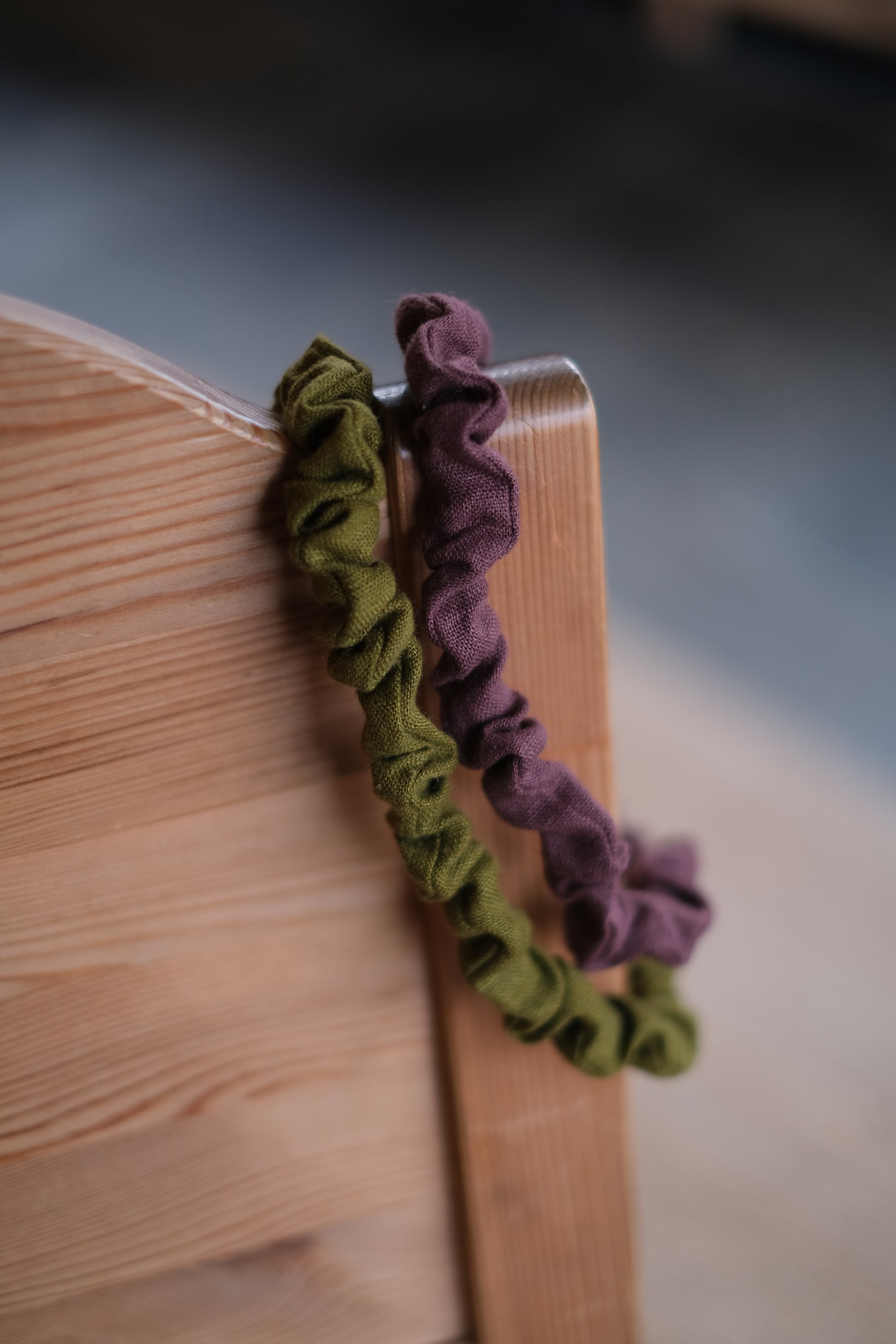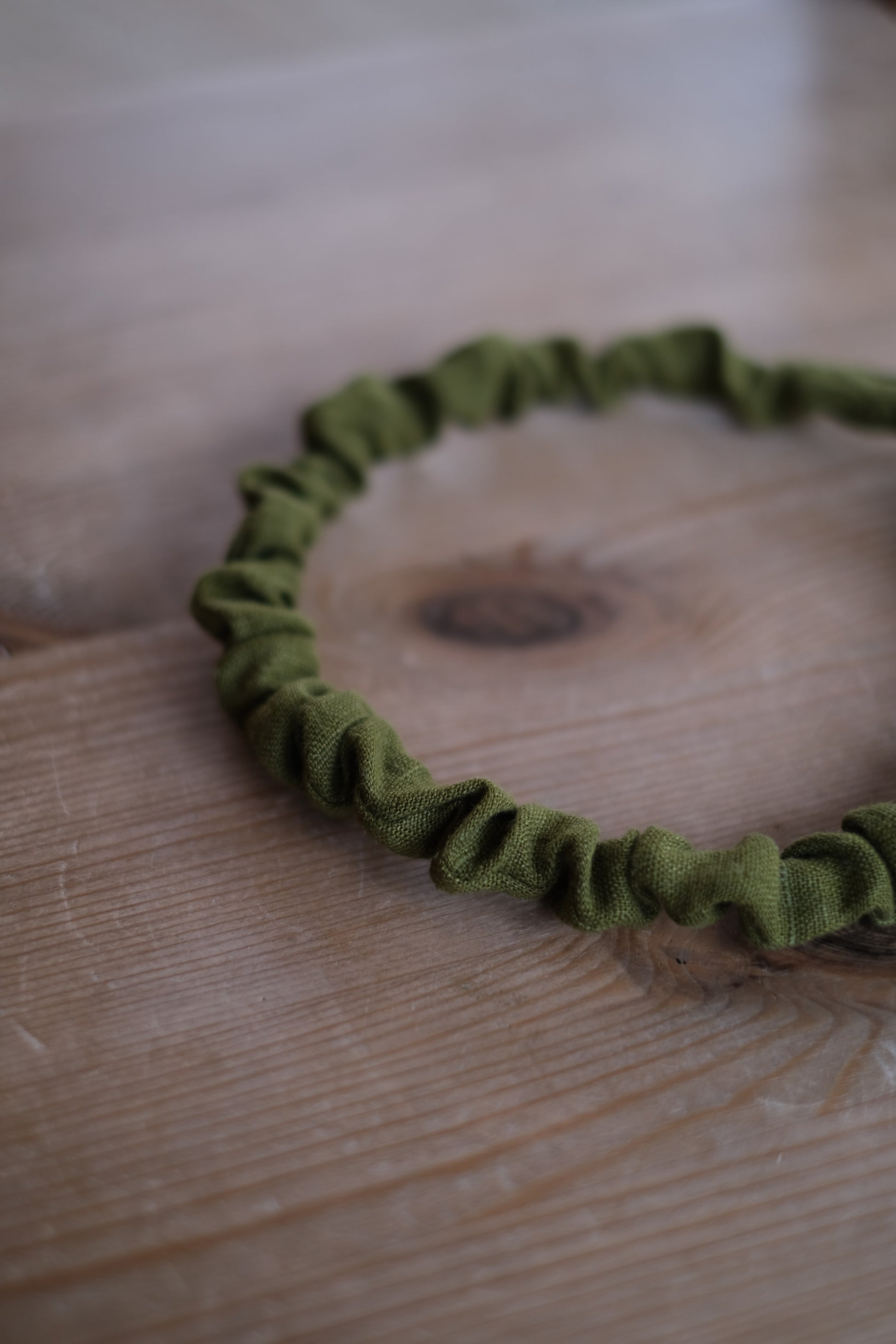 Strikk dekket i linstoff. Ca 1.8 cm bred.