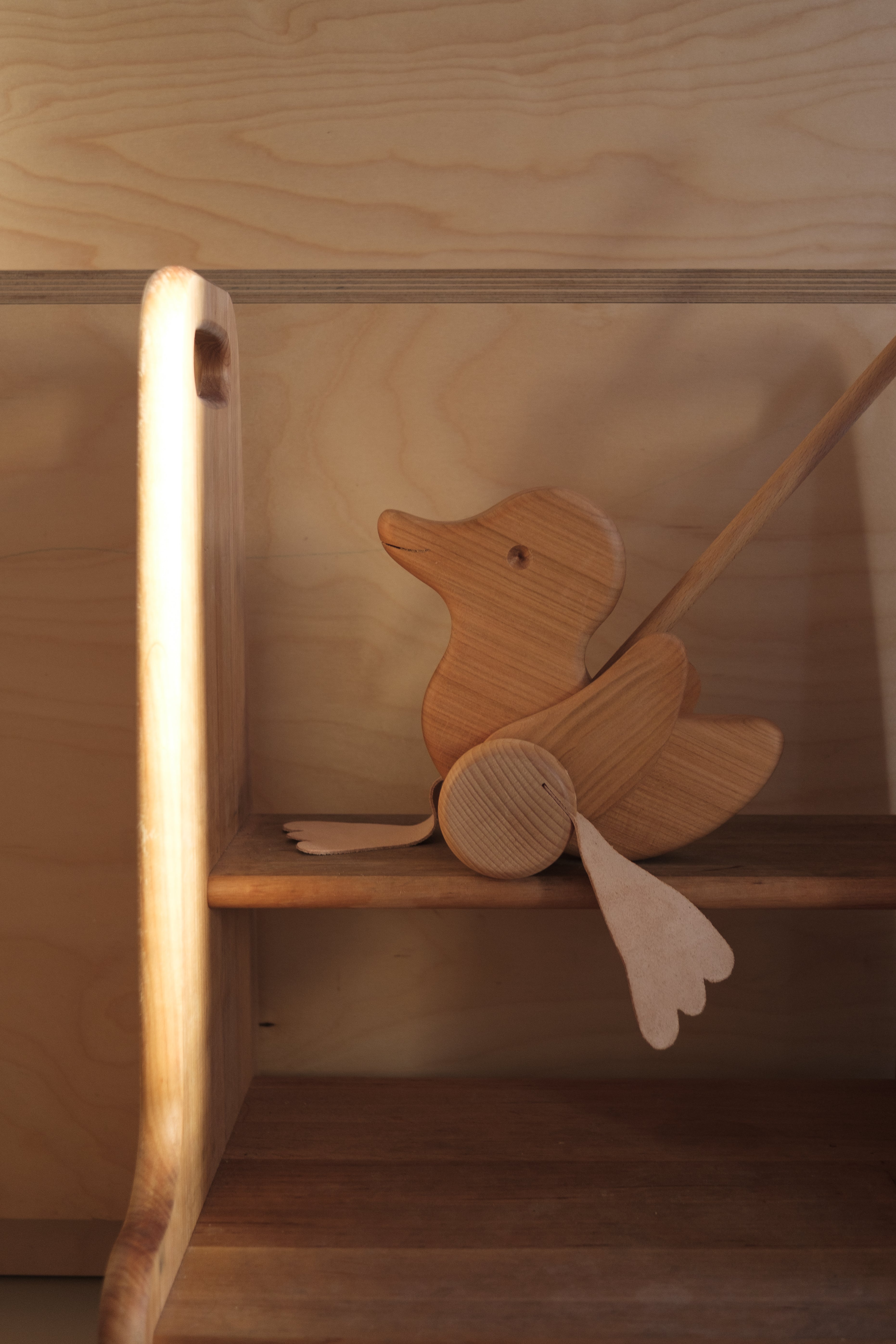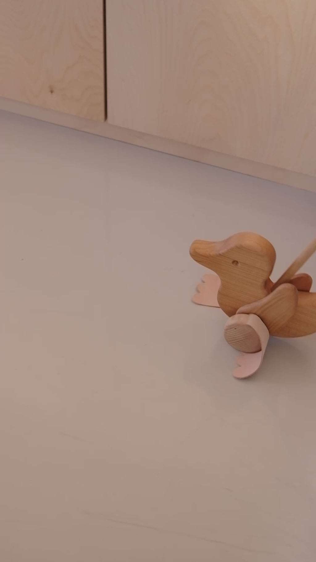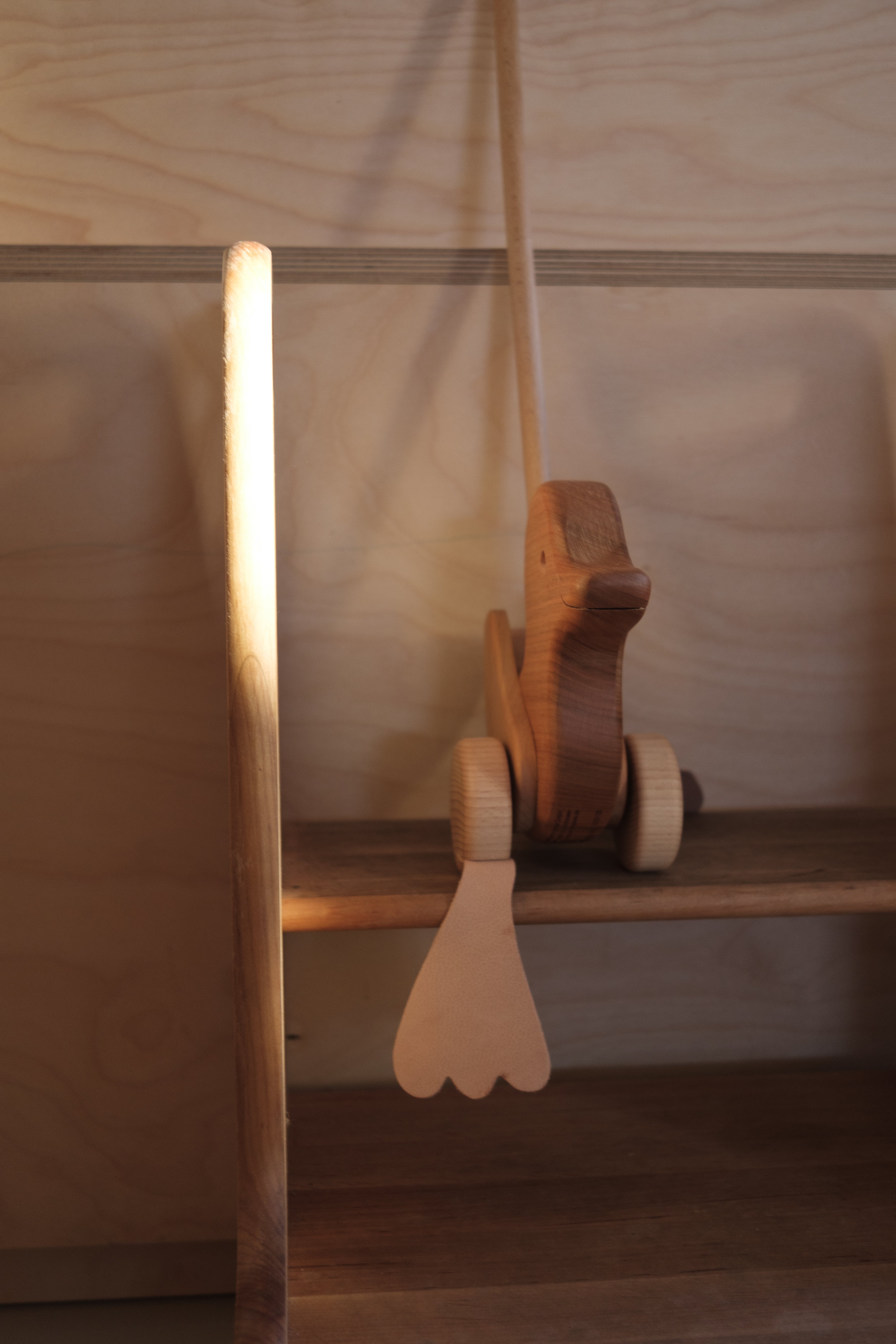 Anden er håndlaget i lokalt kirsebærtre, behandlet med naturlige oljer som fremhever den vakre fargen og beskytter treverket mot smuss. Alle hjørner og kanter er mykt avrundet for trygg lek, og leken er helt fri for spiker og skruer i metall. Kulen på skyvehåndtaket gjør den behagelig å holde, mens andeføtter i lær lager morsomme "plaskelyder" som gir ekstra glede for små oppdagere.