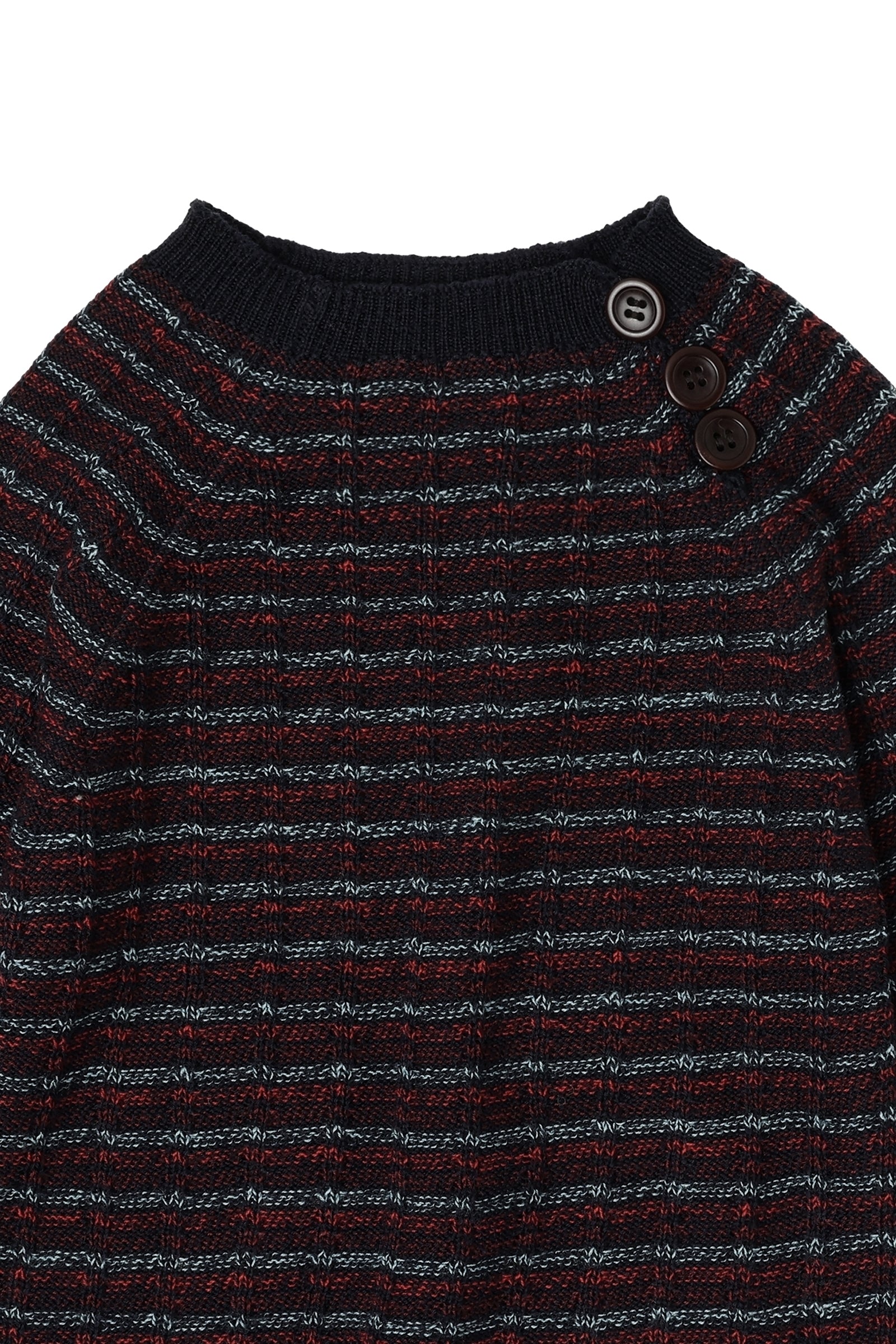 Denne babysweater er lavet af ren merinould og har en ribstrikket halskant, raglanærmer og en afslappet pasform. Den er strikket i en klassisk ribstruktur med smalle garnfarvede striber og har en praktisk knaplukning på skulderen med knapper af corozo-nød. Vores merinould er BLUESIGN® og RWS certificeret, fri for skadelig kemi og stammer fra får, der ikke har været udsat for mulesing.