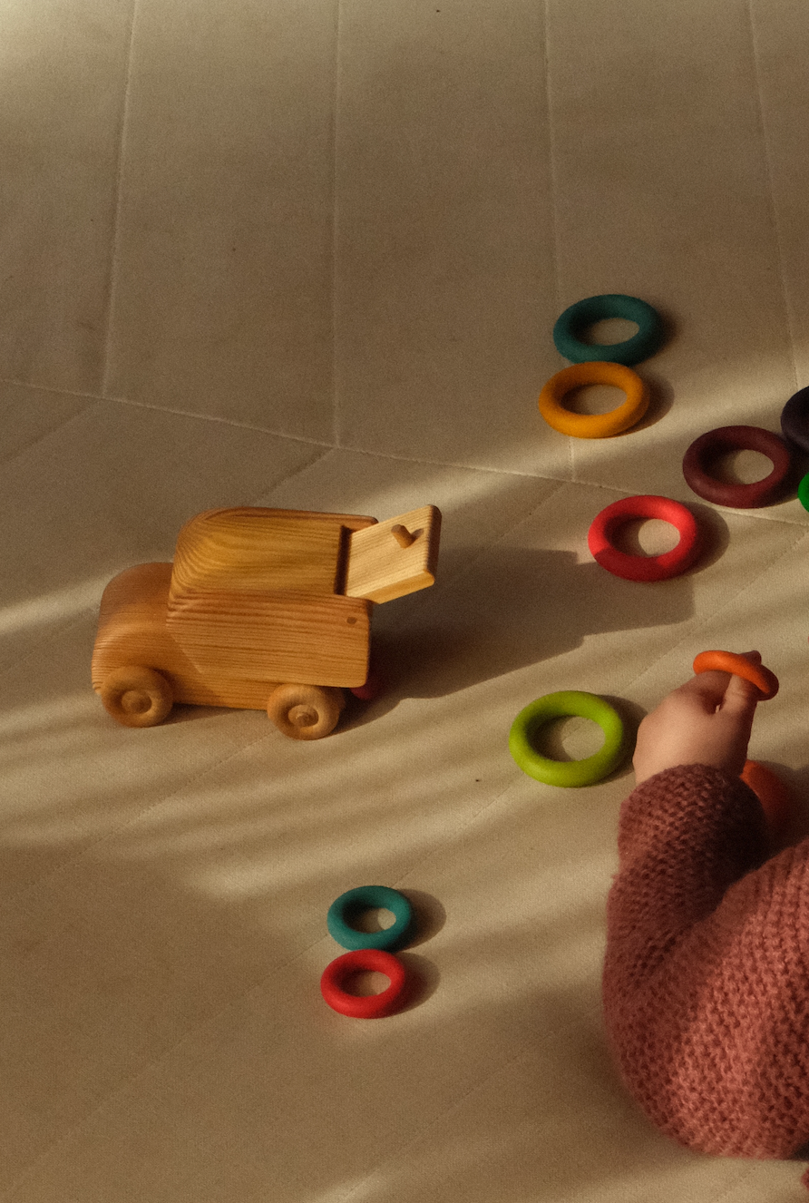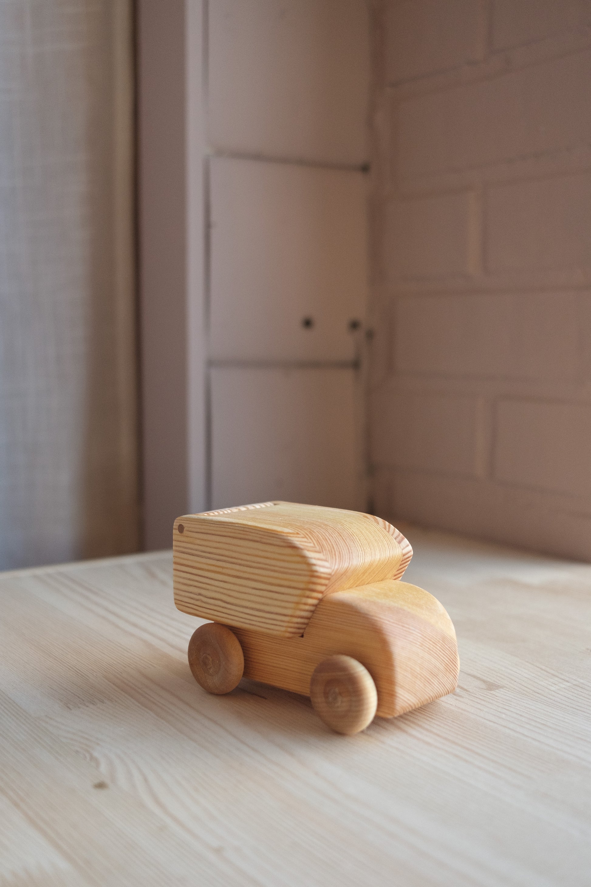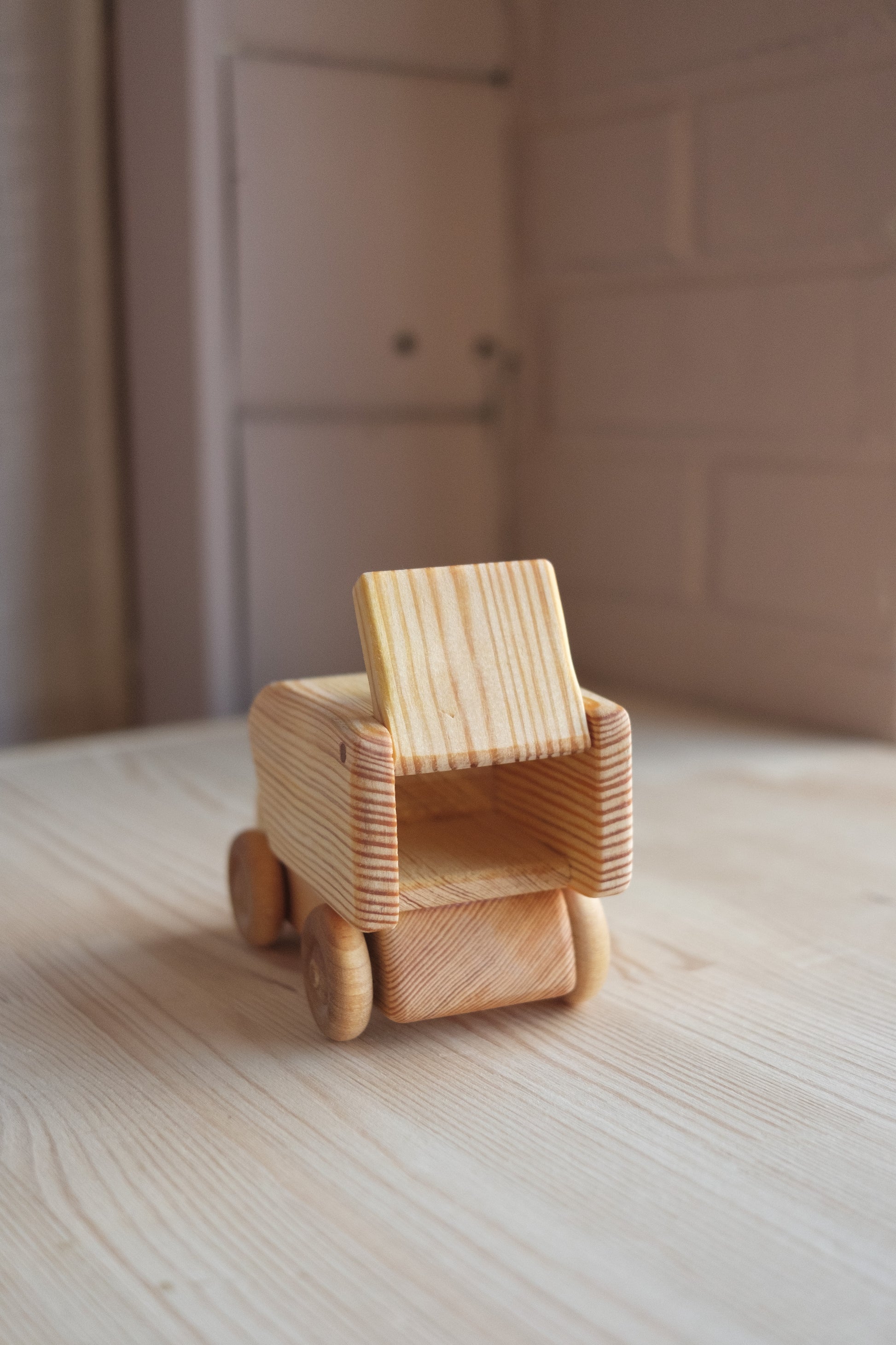 Liten lastebil i tre. Stødig for små barn å leke med.
