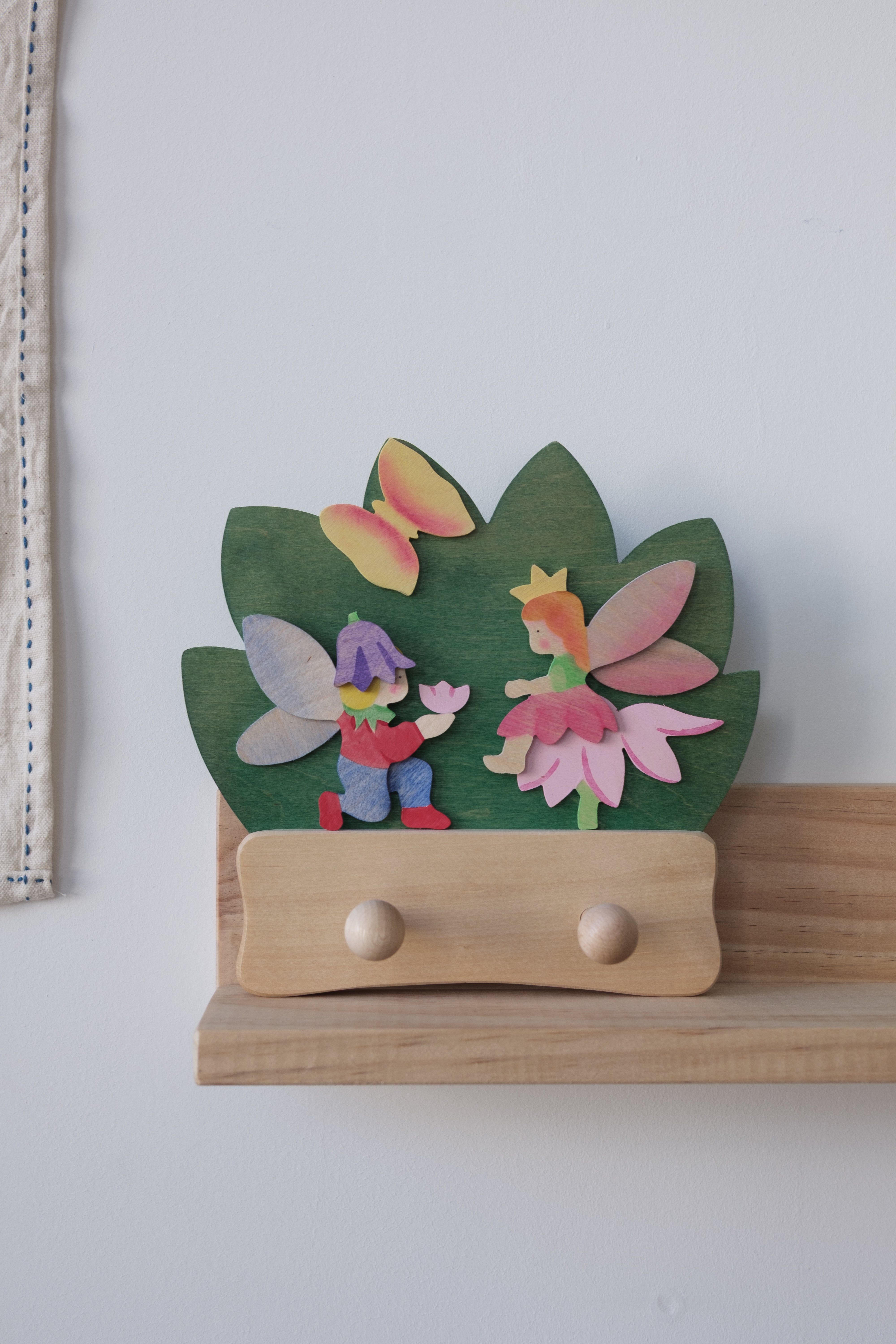Den finne knaggrekken viser to alver og en sommerfugl.