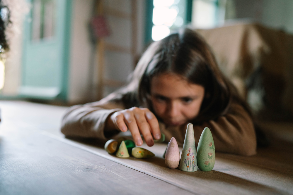 En skog i hendene—dette settet med håndmalte trær er laget for fri lek, med myke former og jordnære toner som inviterer de små til å bygge, arrangere og utforske fritt. Enten de skaper en scene for små dyrevenner, bygger en skogsti, eller bare utforsker og sorterer, bringer disse trærne naturen inn i lekerommet—og oppmuntrer til stille stunder med nysgjerrighet, intensjon og tilknytning.