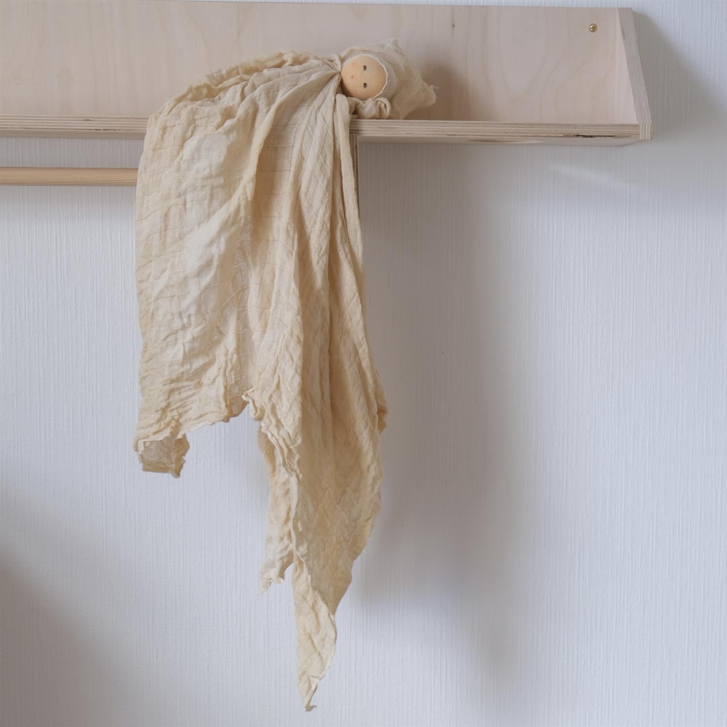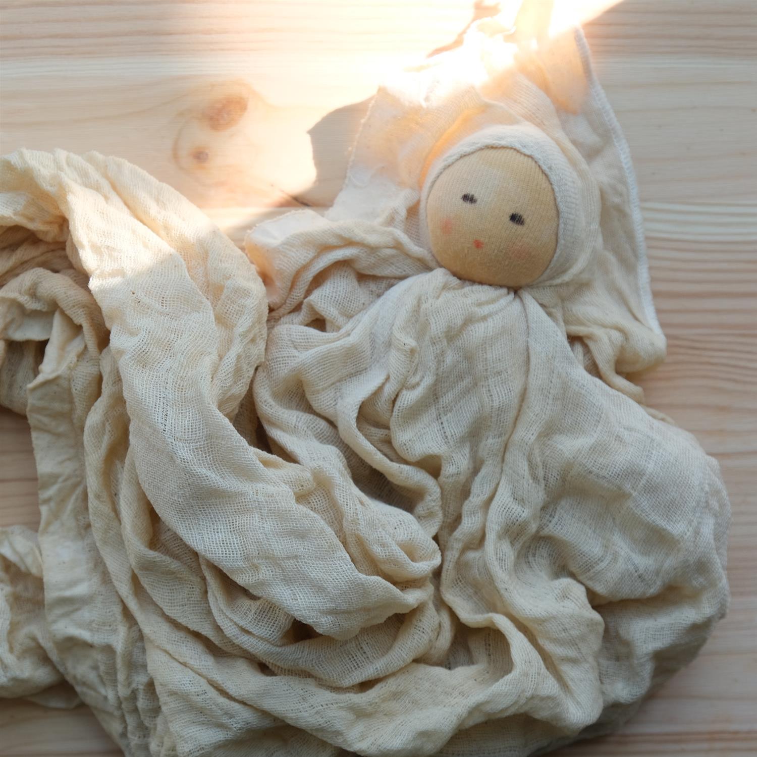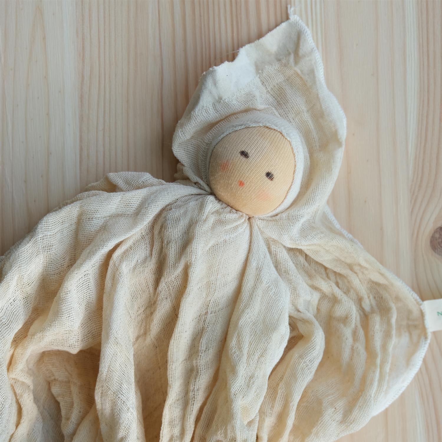 Søt økologisk dukke i ull og bomull med påmalt ansikt. Kroppen til dukken er en koseklut.