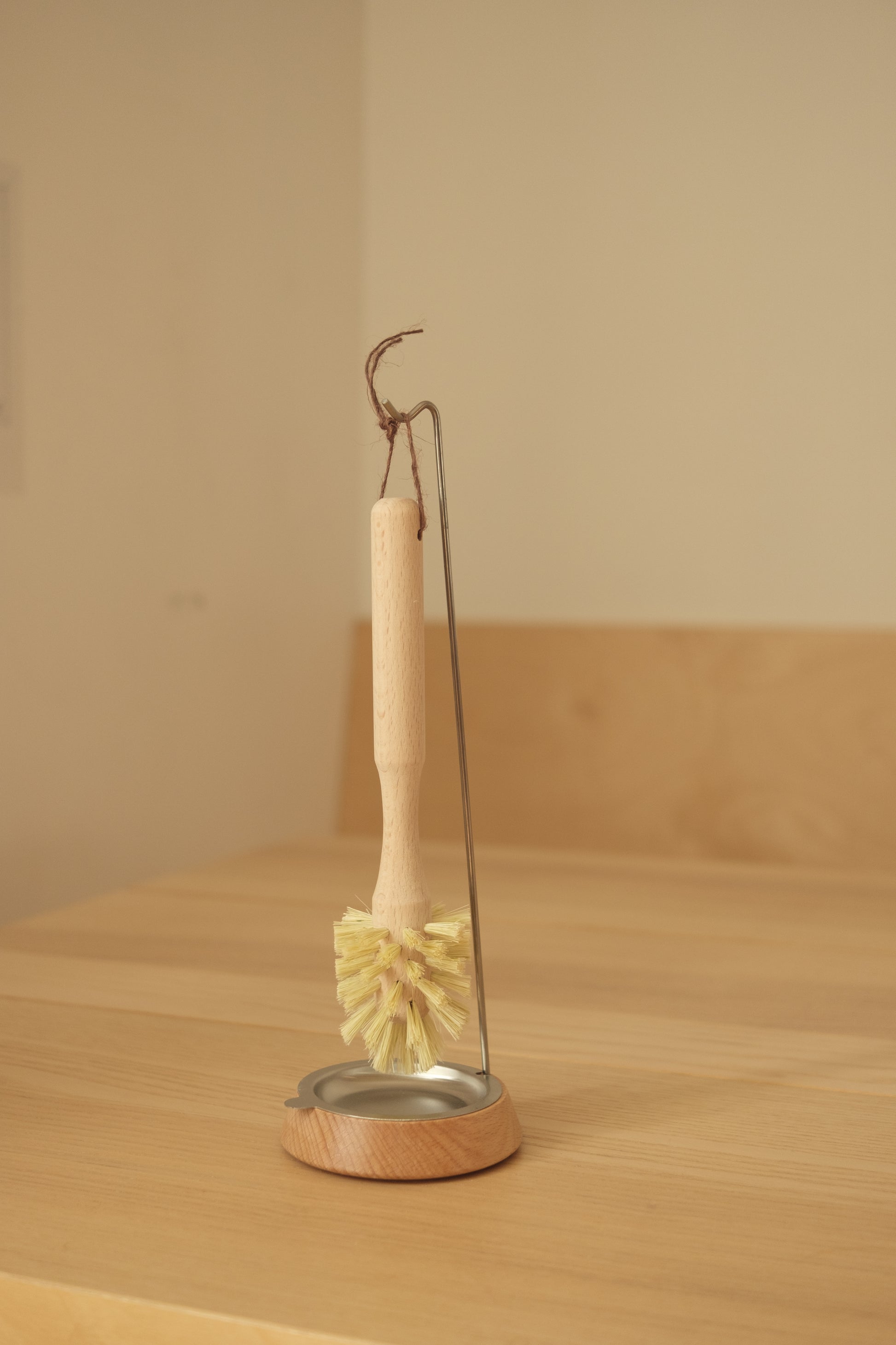 Holder til oppvaskkoster. Den tidløse elegansen til denne holderen får nesten oppvaskbørster til å se ut som designerobjekter. Børsten kan enkelt henges opp fuktig og la den tørke. Små dråper vann samler seg i innsatsen i rustfritt stål under.